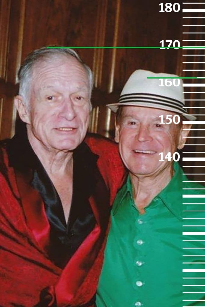В 2012-м году сравним 90-летнего Рэя Энтони с вышеупомянутым, но уже 86-летним Хью Хефнером, рост которого тогда был 170 сантиметров(175 на пике формы, 169 в конце жизни). Здесь рост Рэя также будет на отметке 162 сантиметра.