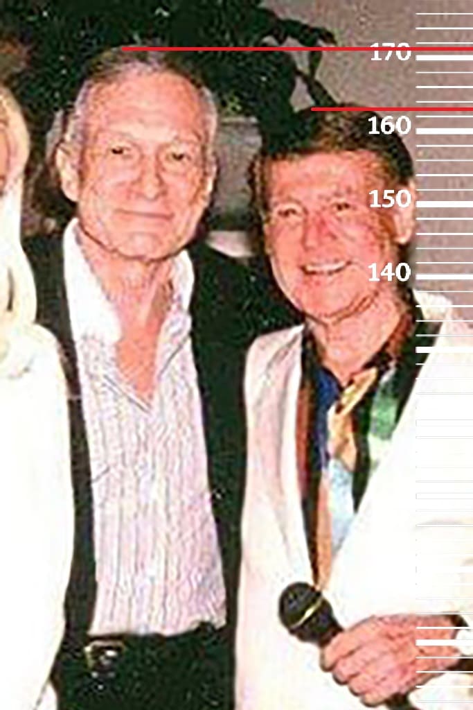 В 2001-м году сравним 79-летнего Рэя Энтони с 75-летним Хью Хефнером, рост которого тогда был 171 сантиметр(175 на пике формы, 169 в конце жизни). Здесь рост Рэя будет также 163 сантиметра.