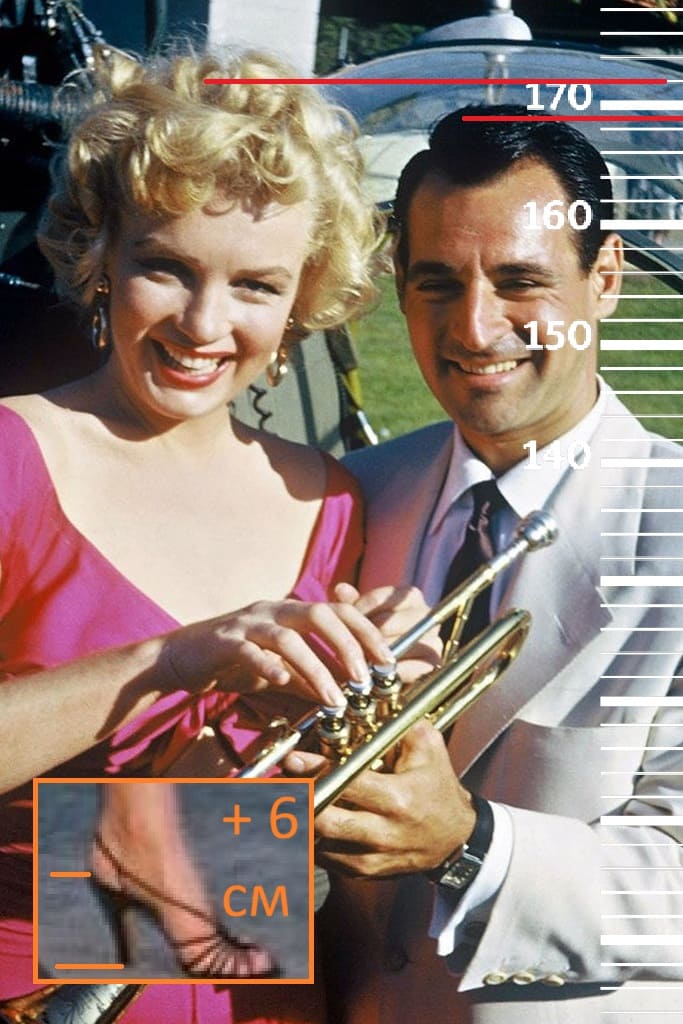 Начнём с 1952-го года. Сравним 30-летнего Рэя Энтони с 26-летней Мэрилин Монро, рост которой при жизни не превышал 166 сантиметров(172 на каблуках). Ссылаясь на отметку из сети, Рэй должен быть выше актрисы даже на каблуках, но здесь рост музыканта будет только на отметке 169 сантиметров. А если вычесть обувь, то отметка будет не выше 167 сантиметров, что на целых 10 сантиметров ниже указанной отметки. Ну и поскольку в 30 лет рост Энтони явно был на пике формы, то смело можно заявлять, что выше этих 167 сантиметров по жизни он точно не был.
