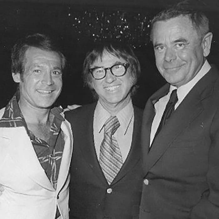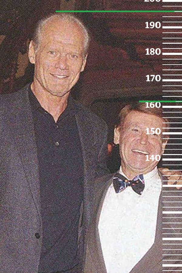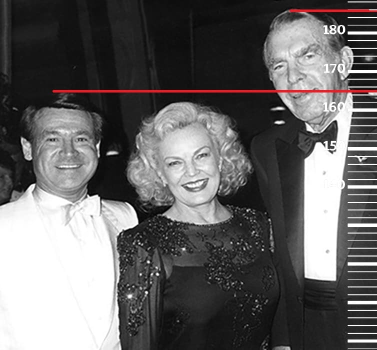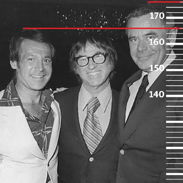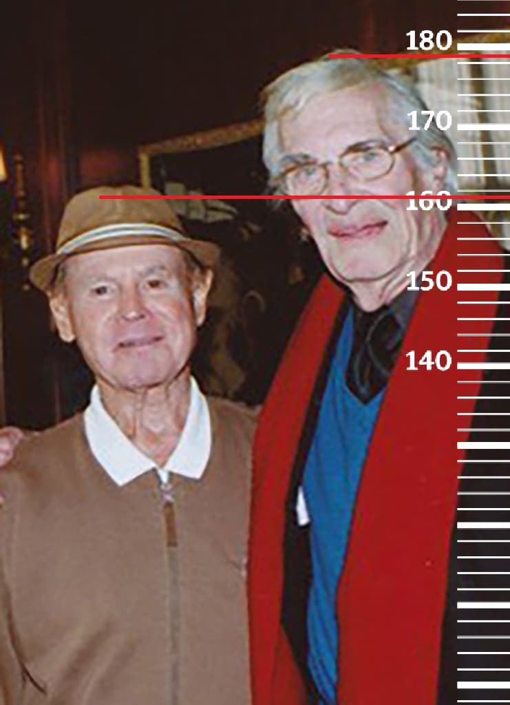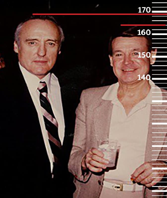 Очередной временной прыжок перенесет нас в 1980-й год. Сравним 58-летнего Рэя Энтони с 72-летним Фредом Макмюрреем, имевшим тогда рост 186 сантиметров(189 на пике формы, 184 в конце жизни). Здесь рост Рэя помещается уже на отметку 165 сантиметров, а значит к 58-ми годам он потерял уже второй сантиметр от своего пикового роста.