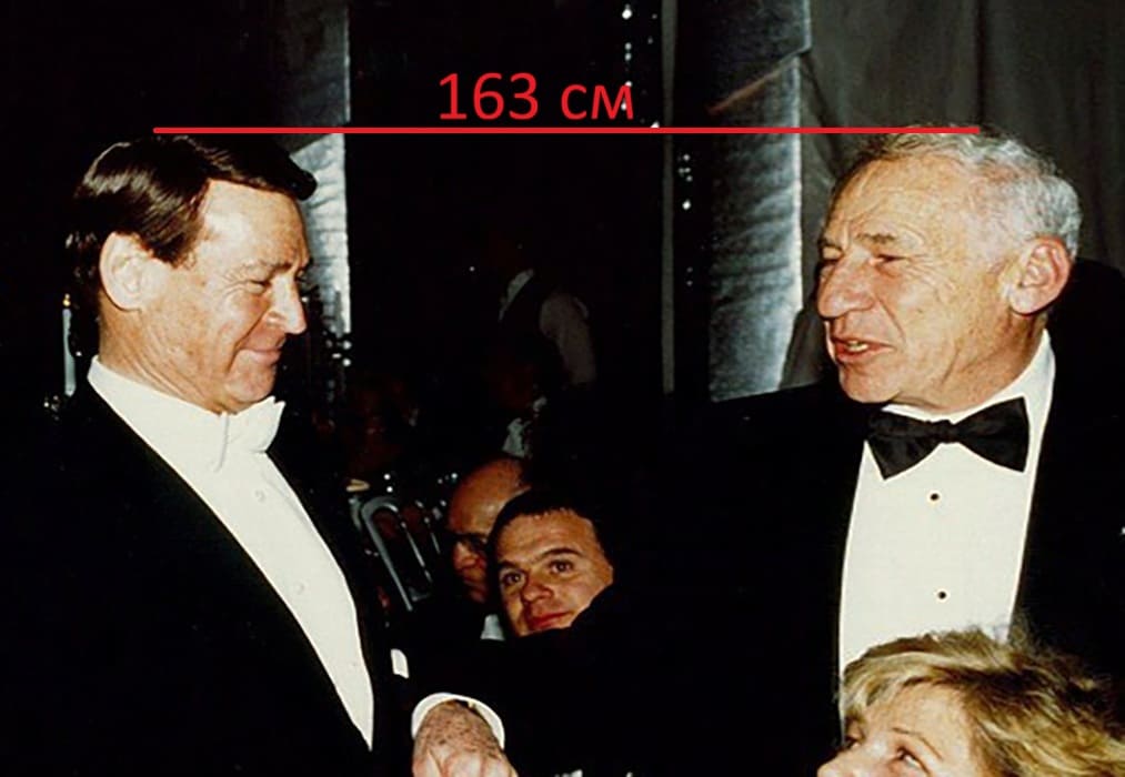 В 1998-м году сравним 76-летнего Рэя Энтони с 72-летним Мелом Бруксом, имевшим тогда рост 163 сантиметра(166 на пике формы, 160 сейчас). На тот момент мужчины были одного роста, по 163 сантиметра каждый, а значит, что к 76-ти годам Рэй потерял уже четвёртый сантиметр от своего пикового параметра роста.