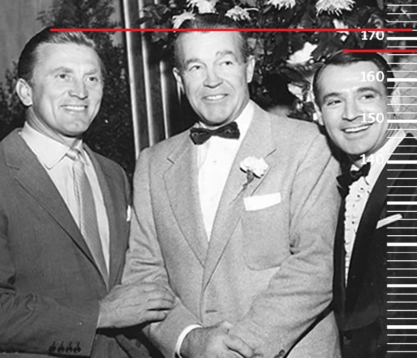 Годом позже, в 1955-м году сравним 33-летнего Рэя Энтони с 39-летним Кирком Дугласом, имевшим тогда свой пиковый рост 172 сантиметра(165 в последние годы жизни). Здесь рост Рэя также будет на своей пиковой отметке 167 сантиметров.