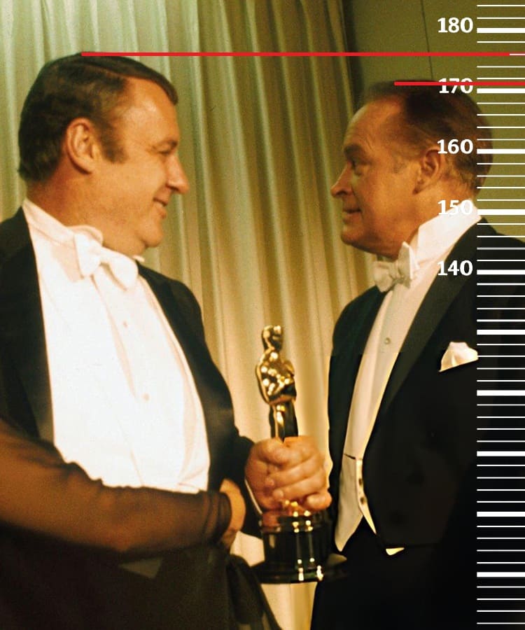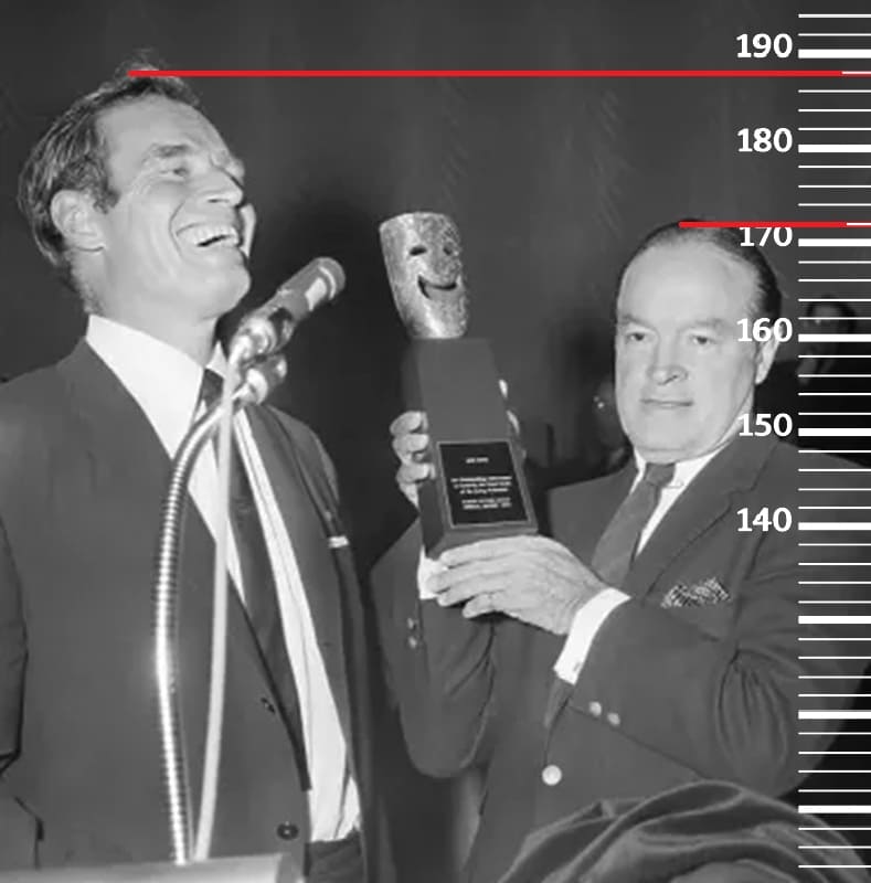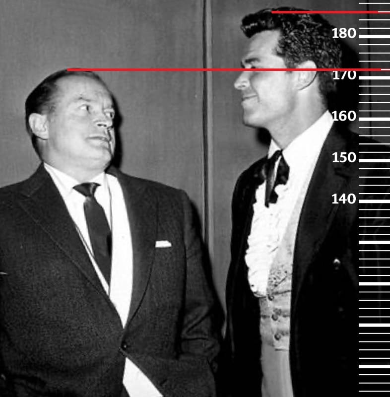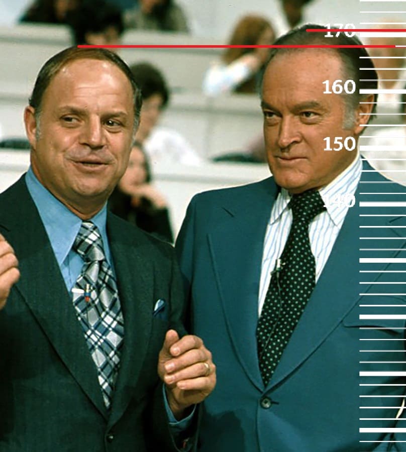 В 1970-м году сравним 67-летнего Боба Хоупа с 44-летним Доном Риклзом, рост которого тогда был на пике формы, а именно 168 сантиметров(163 в последние годы жизни). Здесь рост Боба будет чуть выше 170 сантиметров, а при полном выпрямлении также дойдёт до 171.