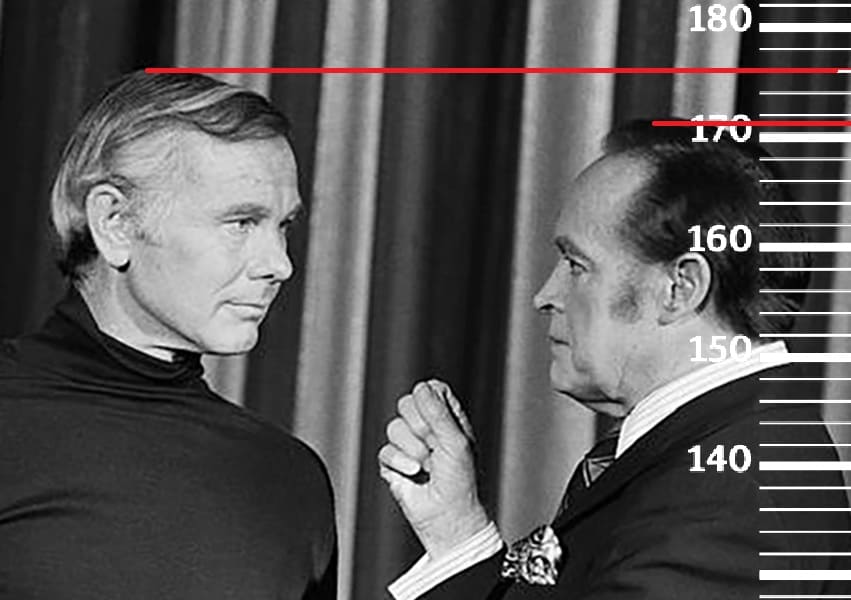 В 1976-м году сравним 73-летнего Боба Хоупа с 51-летним Джонни Карсоном, рост которого тогда составлял 176 сантиметров(177 на пике формы, 173 в поздние годы жизни). Здесь рост Боба будет также 171 сантиметр.