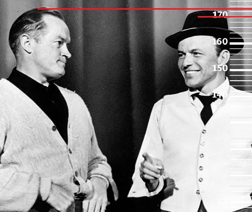 Годом позже, в 1957-м году, сравним 54-летнего Боба Хоупа с 42-летним Фрэнком Синатрой, рост которого тогда был на пике формы, а именно 170 сантиметров(166 в последние годы жизни). Рост Боба вновь будет на отметке 173 сантиметра.