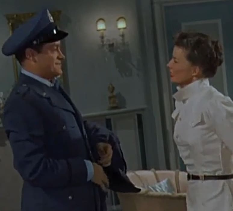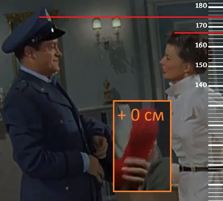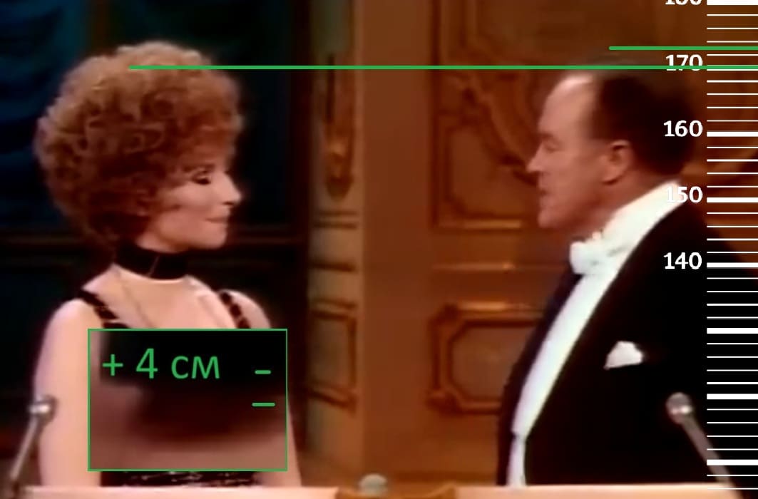 В том же 1956-м году сравним такого же 53-летнего Боба Хоупа с 49-летней Кэтрин Хепберн, рост которой в те годы был 167 сантиметров(168 на пике формы, 163 в поздние годы жизни), но её рост здесь оставим без изменений, поскольку в данной сцене она без обуви. Здесь ситуация идентична - рост Боба будет 175 сантиметров в обуви и 173 без неё.