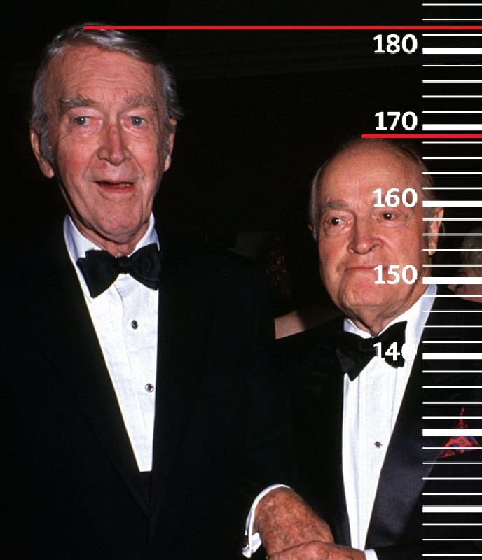 В 1987-м году сравним 84-летнего Боба Хоупа с вышеупомянутым, но уже 79-летним Джеймсом Стюартом, имевшим в те годы рост 183 сантиметра(187 на пике формы, 182 в последние годы жизни). Здесь рост Боба будет уже 169 сантиметров, а значит к 84-м годам он потерял уже пятый сантиметр от своего пикового значения роста.