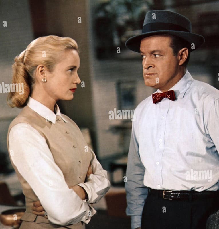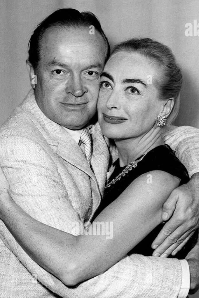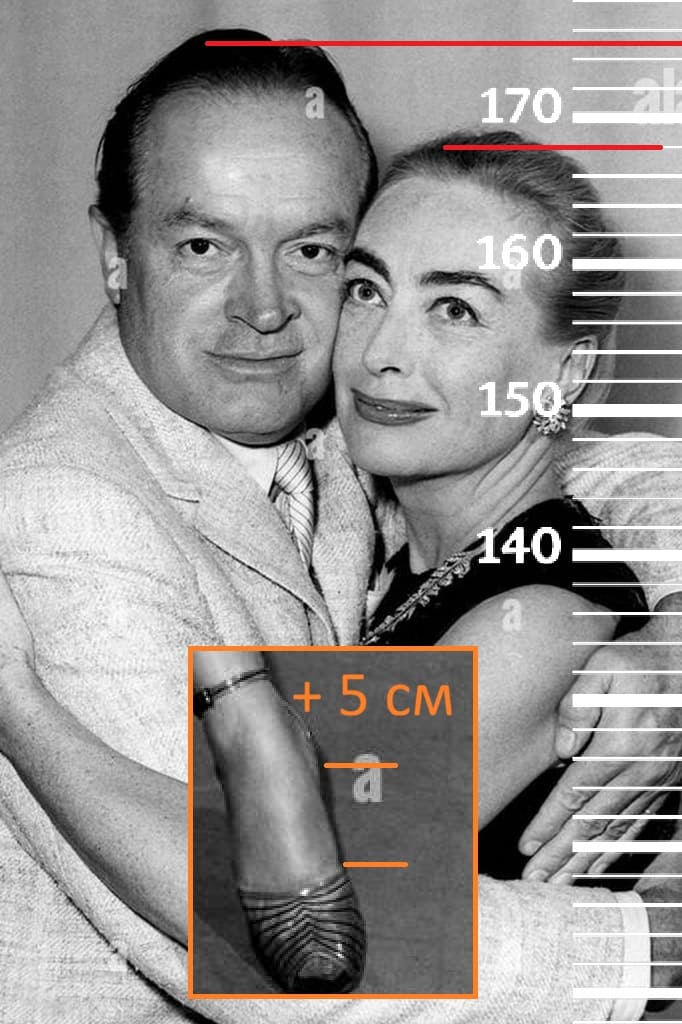 Спустя ещё один год, в 1955-м году, сравним 52-летнего Боба Хоупа с 49-летней Джоан Кроуфорд, рост которой тогда был 163 сантиметра(168 на каблуках, 164 на пике формы, 161 в конце жизни). Здесь рост Боба будет 175 сантиметров, а если вычесть обувь, то также не выше 173.