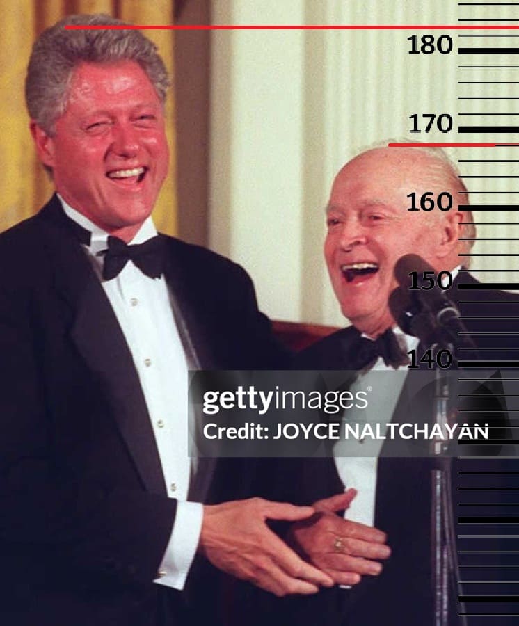 В 1995-м году сравним 92-летнего Боба Хоупа с 49-летним Биллом Клинтоном, имевшим тогда рост 183 сантиметра(184 на пике формы, 181 сегодня). Здесь рост Боба будет уже 168 сантиметров, а значит к 92-м годам он потерял уже шестой сантиметр от пикового параметра роста.