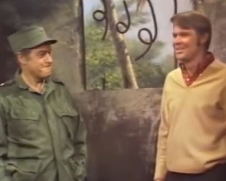 Годом позже, в 1968-м году, сравним 65-летнего Боба Хоупа с 43-летним Родом Стайгером(1 фото) и 32-летним Гленом Кэмпбеллом(2 фото). Рост обоих сравниваемых с Бобом мужчин на тот момент - пиковый, а именно 176 и 181 сантиметр, соответственно (172 и 177 в последние годы жизни). В обоих случаях рост Хоупа будет уже чётко на отметке в 171 сантиметр.