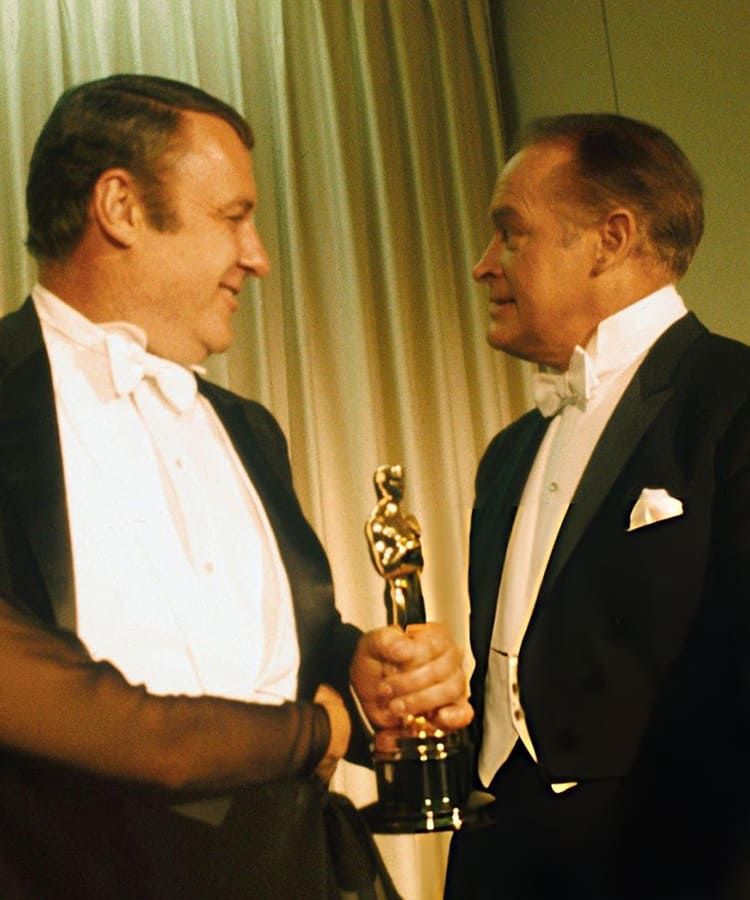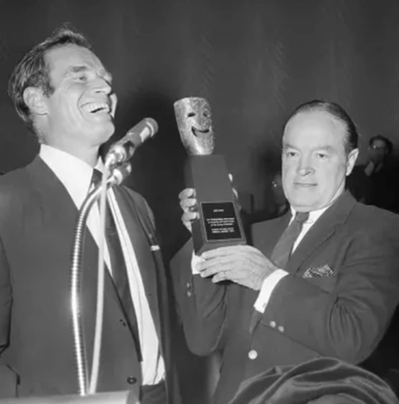 Годом позже, в 1965-м году, сравним 62-летнего Боба Хоупа с 42-летним Чарлтоном Хестоном, рост которого тогда был на пике формы, а именно 188 сантиметров(184 в последние годы жизни). Здесь рост Боба будет также на 172 сантиметрах.