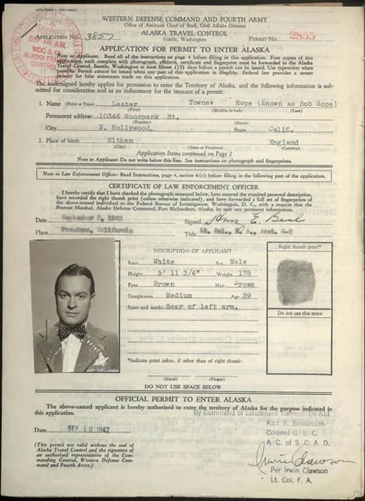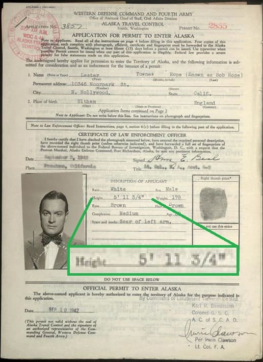Перед началом сравнительной части обзора рассмотрим заявление Боба Хоупа на въезд на Аляску от 1942 года. Здесь 39-летним Боб указал свой рост, как 5 футов 11.75 дюймов, что будет вообще аж около 182 сантиметров. Далее, сравнив Хоупа с другими знаменитостями, мы узнаем, верны ли эти цифры.