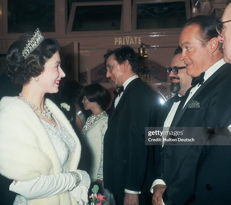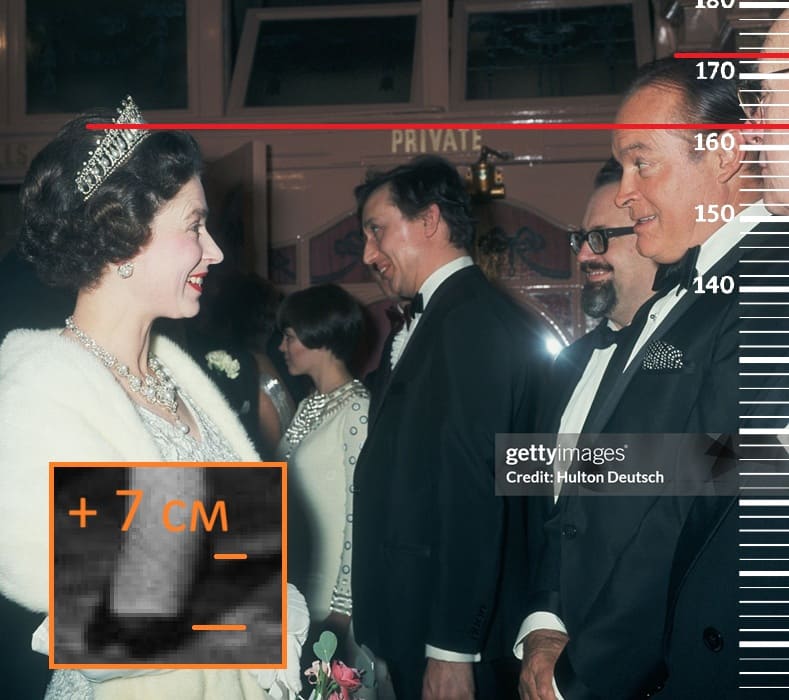 В 1967-м году сравним 64-летнего Боба Хоупа с 41-летней Елизаветой Второй, имевшей тогда свой пиковый рост 156 сантиметров(163 на каблуках, 149 в последние годы жизни). Здесь рост Боба будет 173 сантиметра в обуви и уже 171 сантиметр без неё, а значит к 64-м годам он потерял уже третий сантиметр от своего пикового роста.