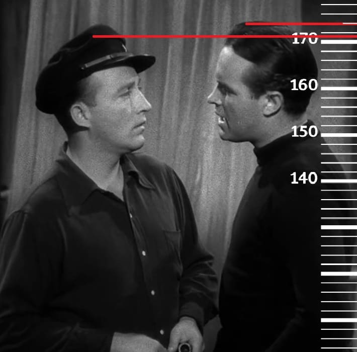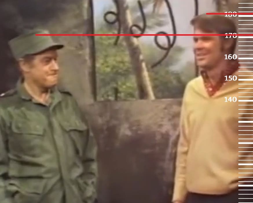 Годом позже, в 1954-м году, сравним 51-летнего Боба Хоупа с 46-летним Фредом Макмюрреем, рост которого тогда был 188 сантиметров(189 на пике формы, 184 в последние годы жизни). Здесь рост Боба также занимает за собой отметку в 173 сантиметра.