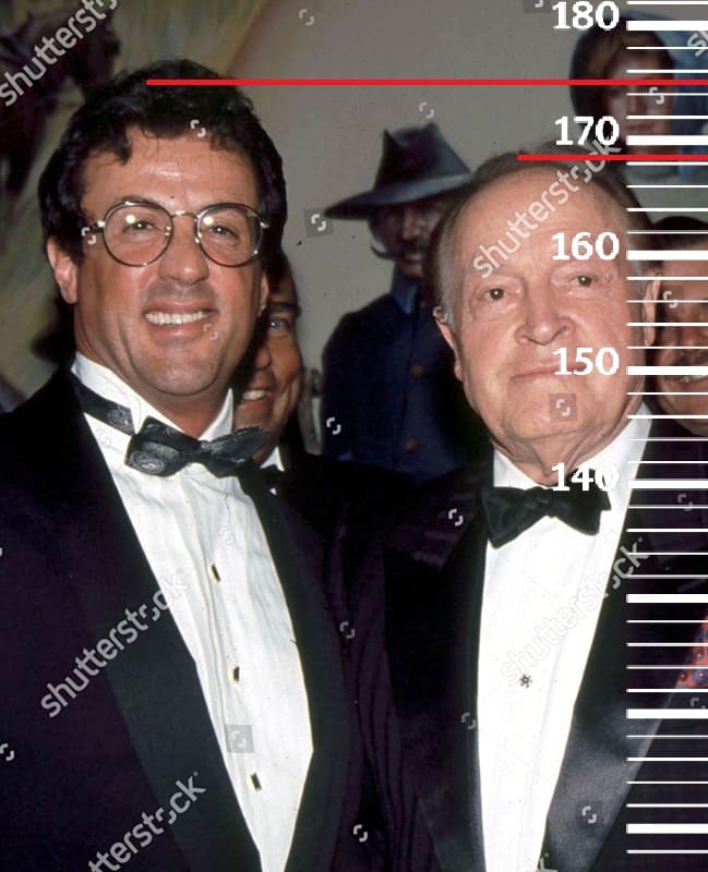 В 1993-м году сравним 90-летнего Боба Хоупа с 47-летним Сильвестром Сталлоне(1 фото) и 43-летним Джеем Лено(2 фото). Рост обоих сравниваемых с Бобом мужчин на тот момент - пиковый, а именно 175 и 178 сантиметров, соответственно(173 и 176 в наши дни). В обоих случаях рост Хоупа будет 168.5-169 сантиметров.
