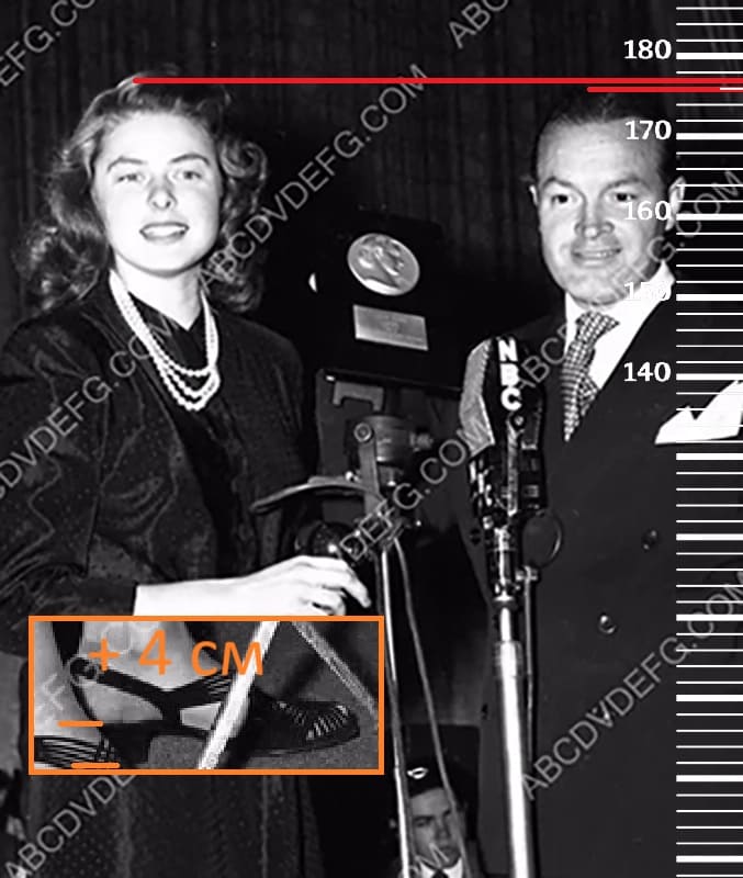 В 1946-м году сравним 43-летнего Боба Хоупа с 31-летней Ингрид Бергман, рост которой тогда был на пике формы, то есть 173 сантиметра(177 на каблуках, 170 в последние годы жизни). Здесь рост Боба будет уже 176 сантиметров, но если вычесть из этого обувь, то также получится на выше 174 сантиметров.