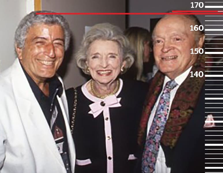 Ну и под конец, в 2001-м году, сравним 98-летнего Боба Хоупа с 75-летним Тони Беннеттом, рост которого тогда был 167 сантиметров(171 на пике формы, 165 в последние годы жизни). Здесь рост Боба также будет 168 сантиметров. Ну и поскольку через два года после фото Боб Хоуп умрёт, можно в целом утверждать, что он больше не потерял, а так и покинул свет с ростом 168 сантиметров. Однако вероятность существует, что к 100 годам (возраст Боба на момент смерти) он потерял и седьмой сантиметр, но подтверждения этому не найти. после 2001-го года Хоуп не появлялся на публике.