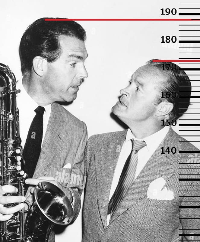 В 1942-м году сравним 39-летнего Боба Хоупа с 27-летним Энтони Куинном, имевшим тогда свой пиковый рост 182 сантиметра(177 в последние годы жизни). Здесь рост Боба будет также на своей пиковой отметке 174 сантиметра.