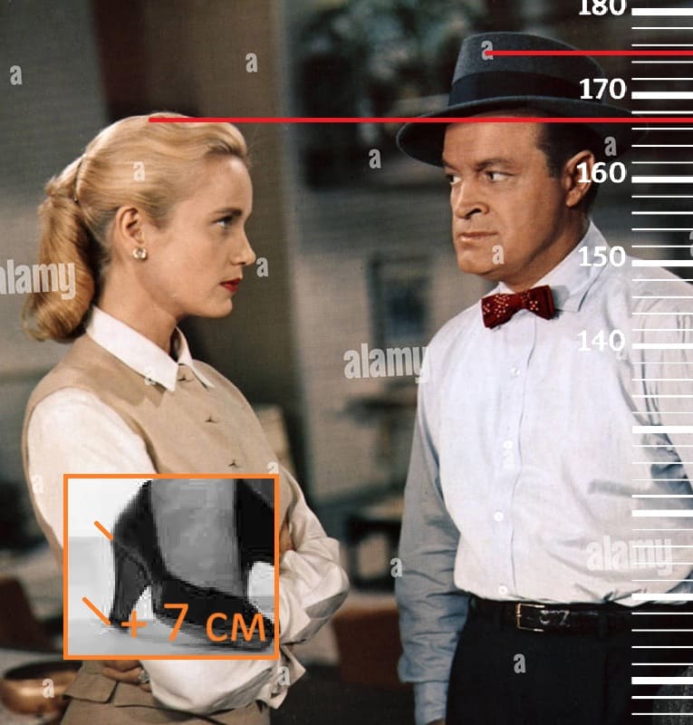 В 1956-м году сравним 53-летнего Боба Хоупа с 32-летней Евой Мари Сэйнт, имевшей тогда свой пиковый рост 160 сантиметров(167 на каблуках, 154 сейчас). Здесь рост Боба будет 175 сантиметров в обуви и 173 сантиметра без неё.