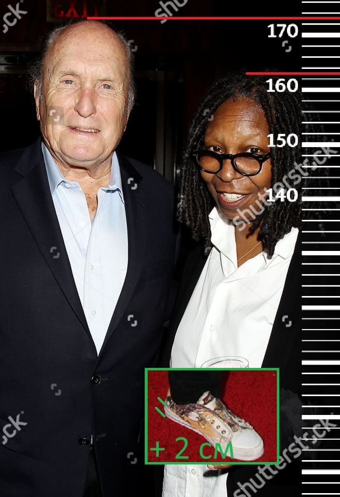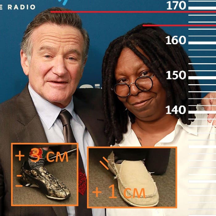 Рост Робина Уильямса в последние годы также не превышал 166 сантиметров (169 в обуви). Без обуви рост Вупи Голдберг будет уже 164 сантиметра, а значит с момента смерти Робина в 2014-м году она потерял 1 сантиметр роста.