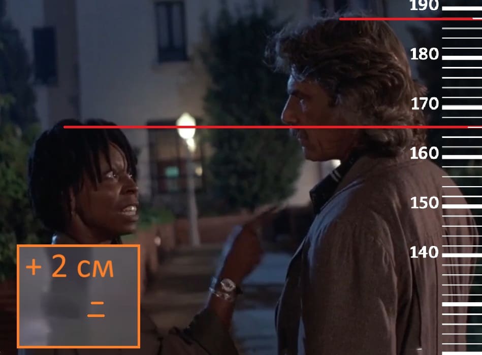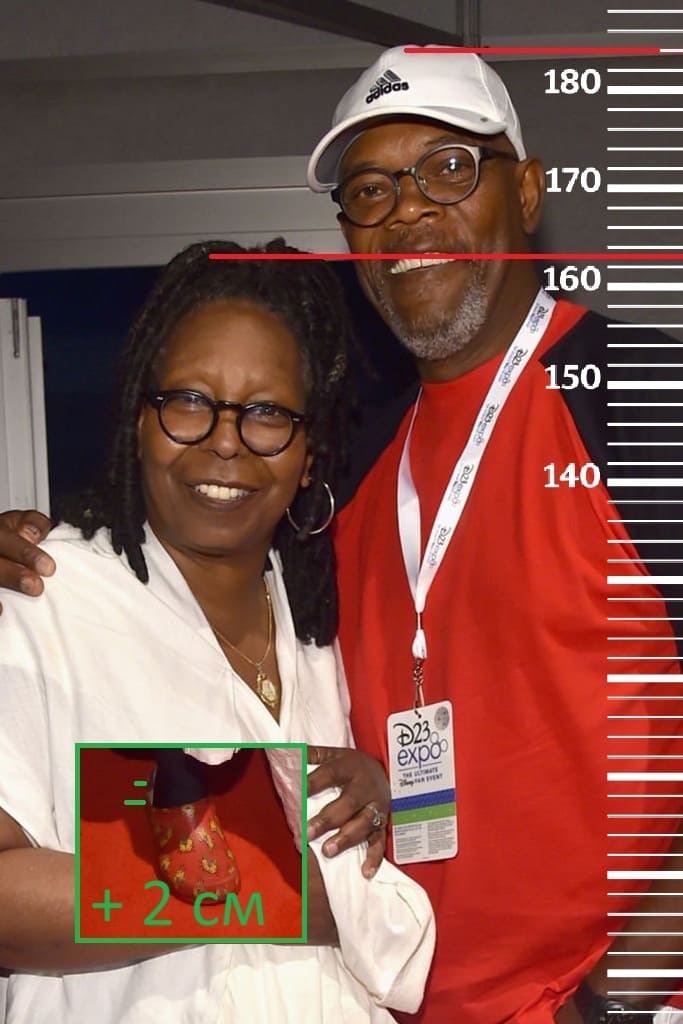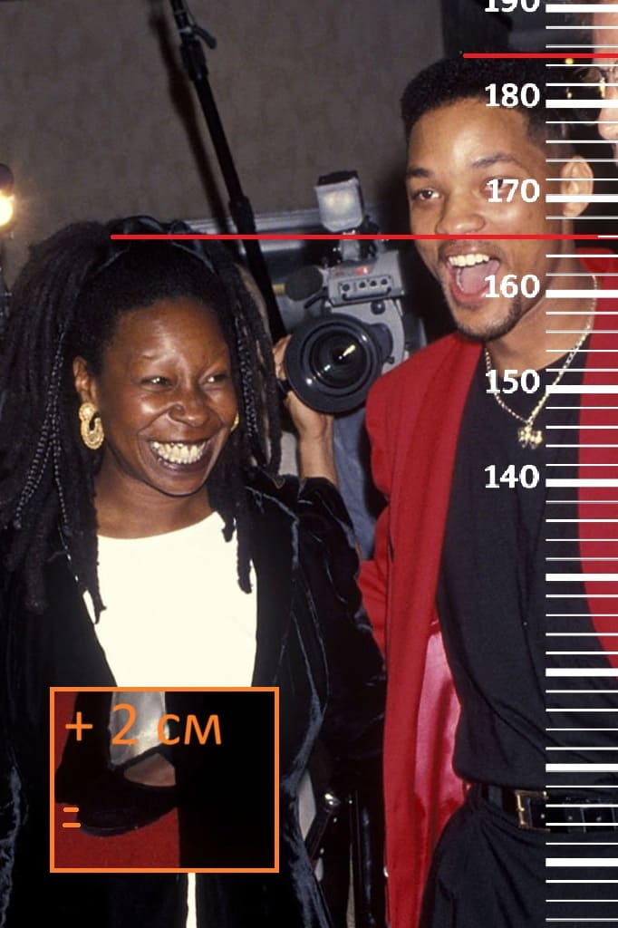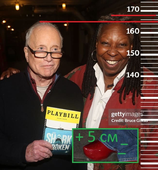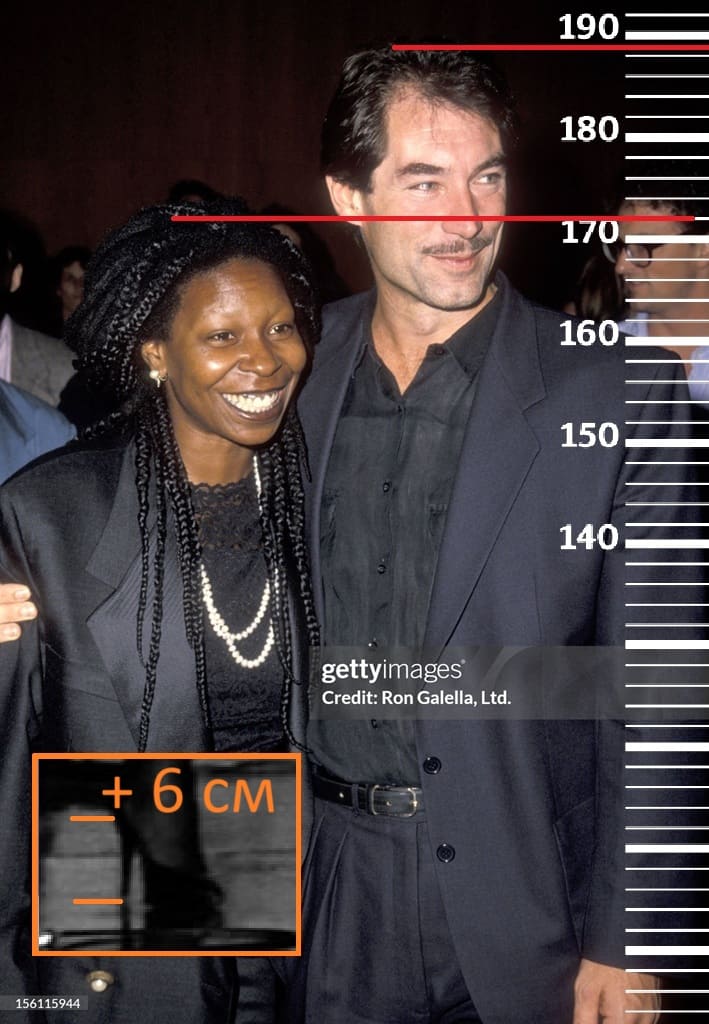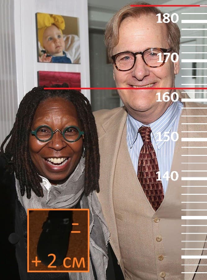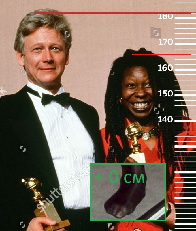 Тони Голдуин немного ниже них, а именно 180 сантиметров. Рост Вупи Голдберг здесь также составил 163 сантиметра.