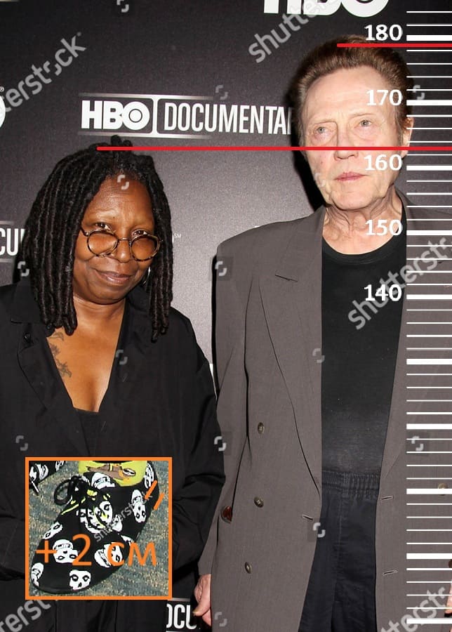 Кристофер Уокен немного выше, а именно 179 сантиметров. Здесь рост Вупи Голдберг также поместился на отметку 163 сантиметра.