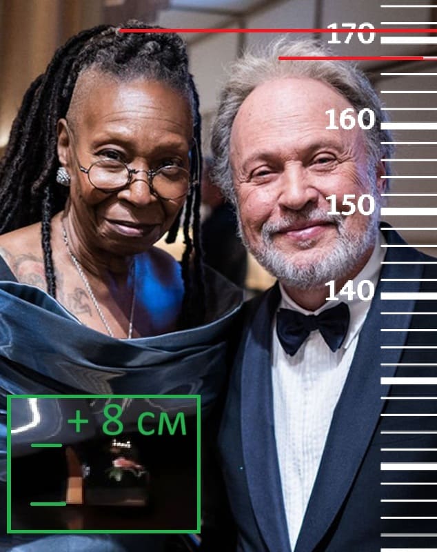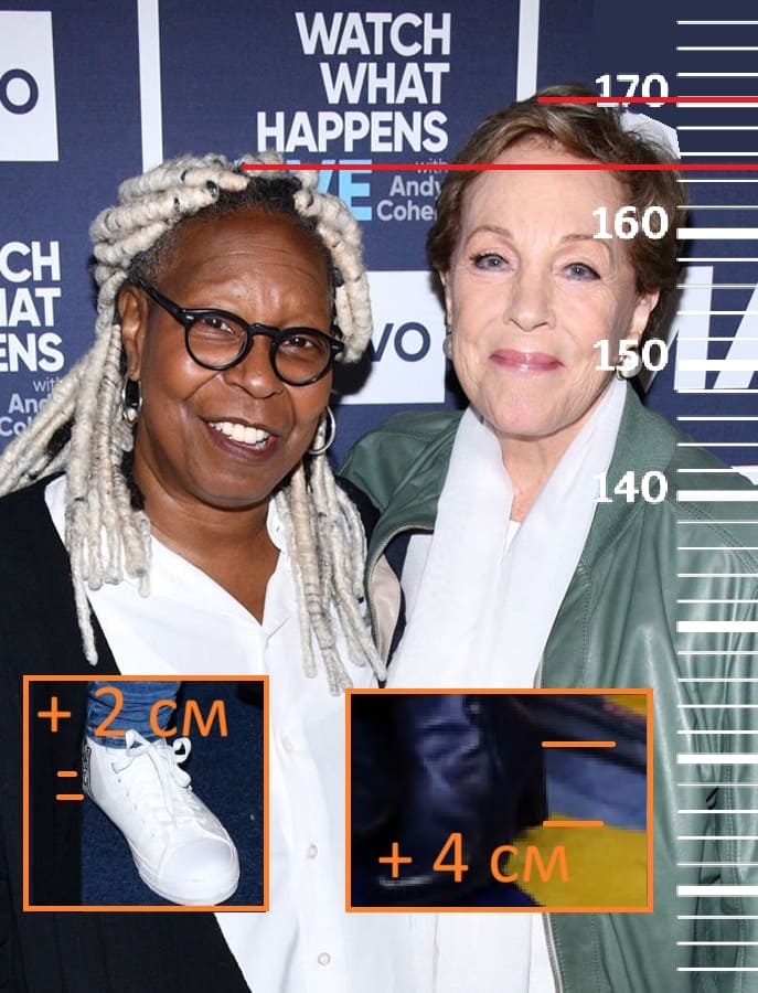Билли Кристал(1 фото) и Джули Эндрюс(2 фото) также имеют одинаковый рост, но по 166 сантиметров у каждого (168 и 170 сантиметров в обуви, соответственно). В обоих случаях рост Вупи Голдберг без обуви будет на той же отметке в 163 сантиметра.