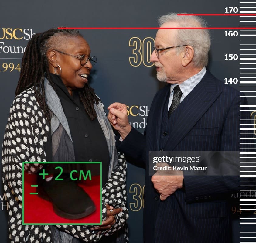 Стивен Спилберг немного ниже, а именно 169 сантиметров. Здесь рост Вупи Голдберг по-прежнему будет 163 сантиметра.