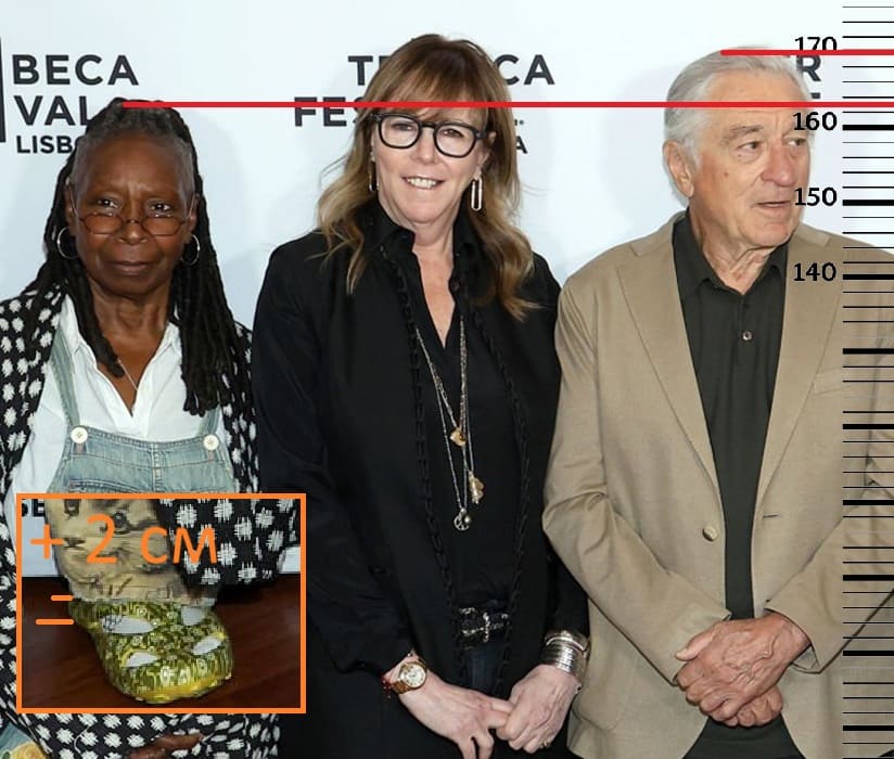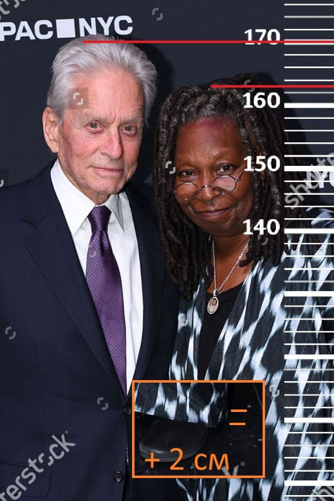 Роберт Де Ниро(1 фото), Майкл Дуглас(2 фото) и Бен Кингсли(3 фото) имеют одинаковый рост по 170 сантиметров каждый. Во всех трёх случаях рост Вупи Голдберг будет также на отметке 163 сантиметра.