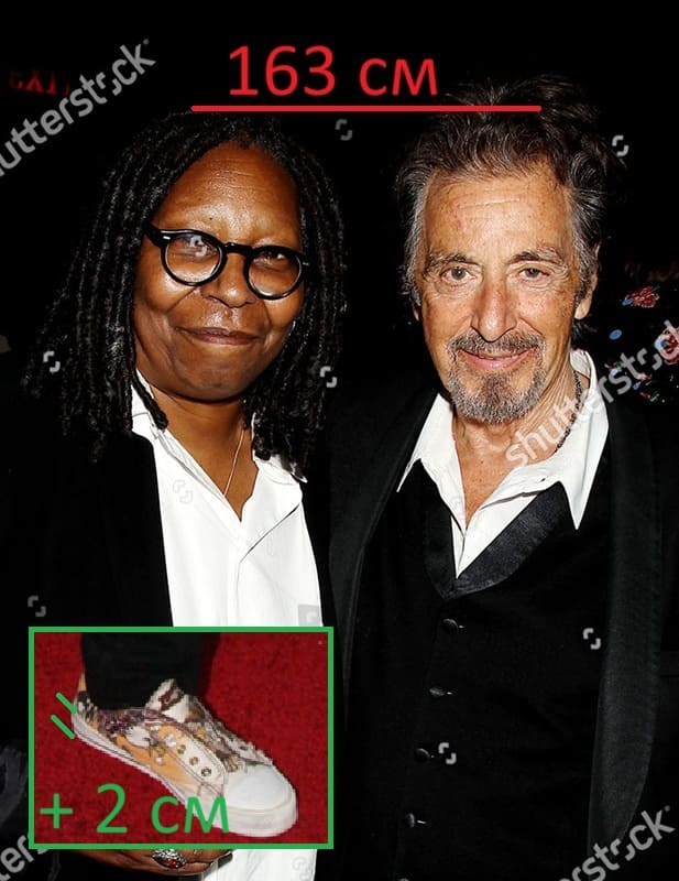 Аль Пачино немного выше, а именно 163 сантиметра. Здесь он и Вупи Голдберг абсолютно одного роста.