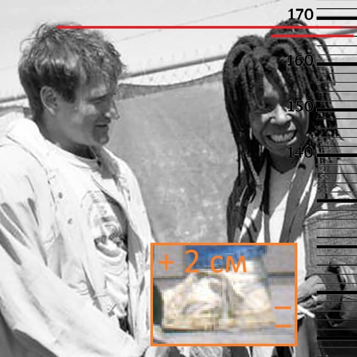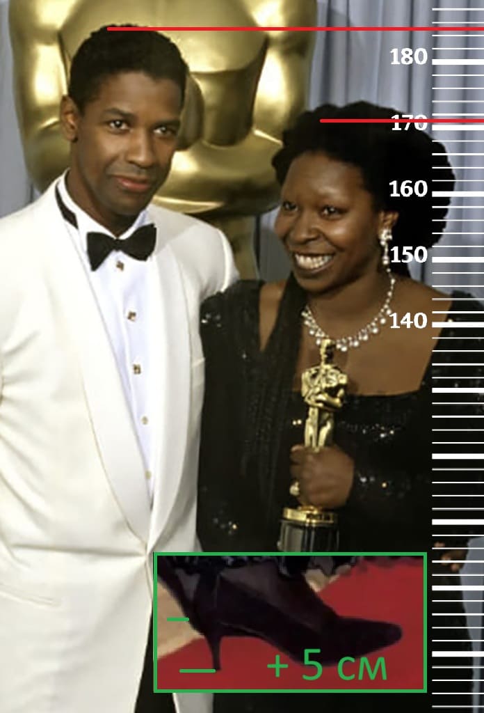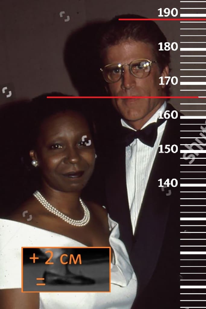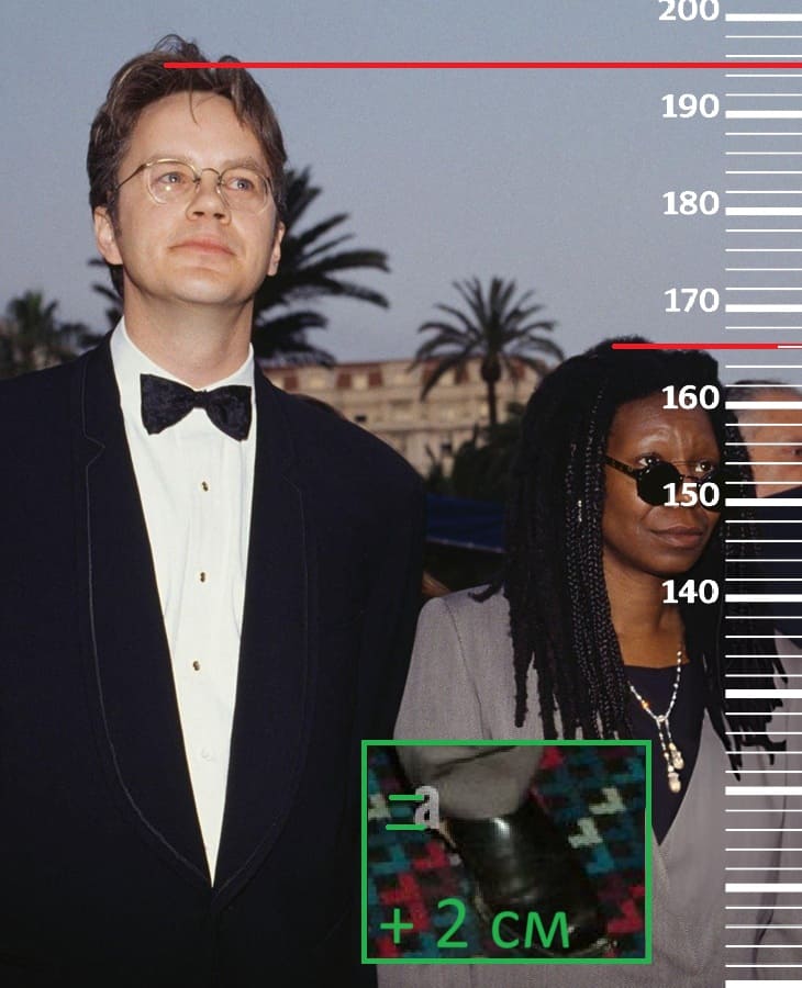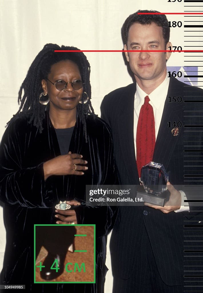 В 1995-м году сравним 40-летнюю Вупи Голдберг с 39-летним Томом Хэнксом, рост которого тогда был на пике формы(185 в обуви, 181 сейчас). Здесь рост Вупи будет 170 сантиметров, но с вычетом обуви мы также получим 166 сантиметров.