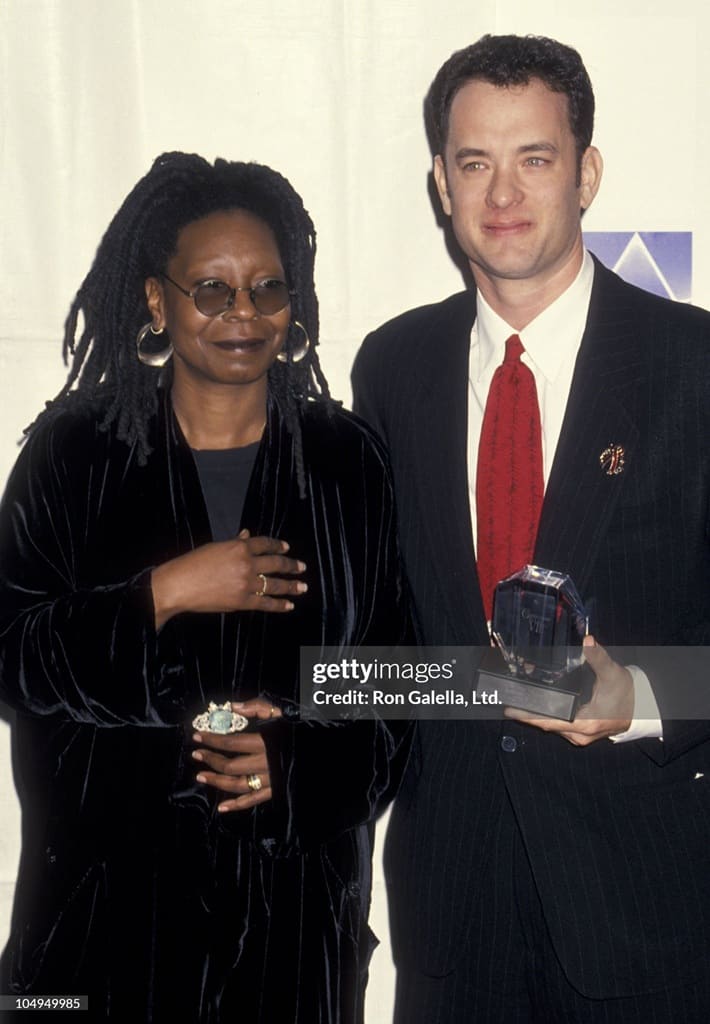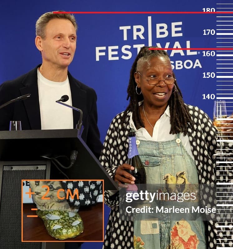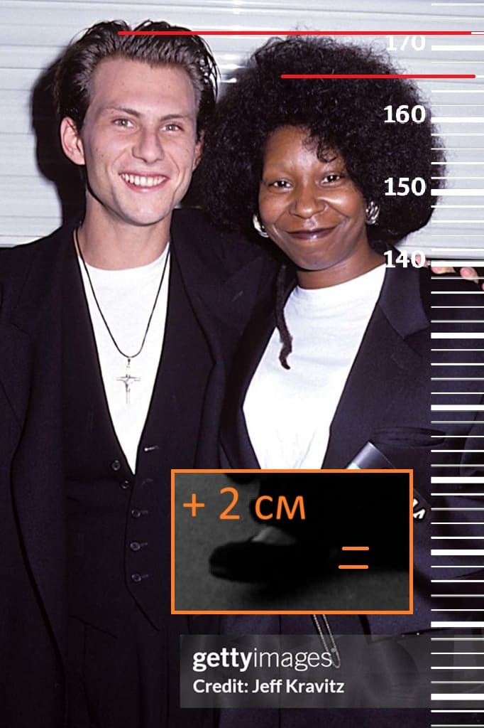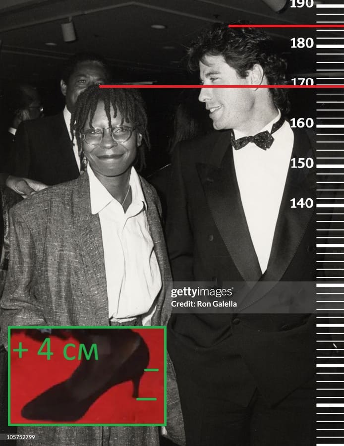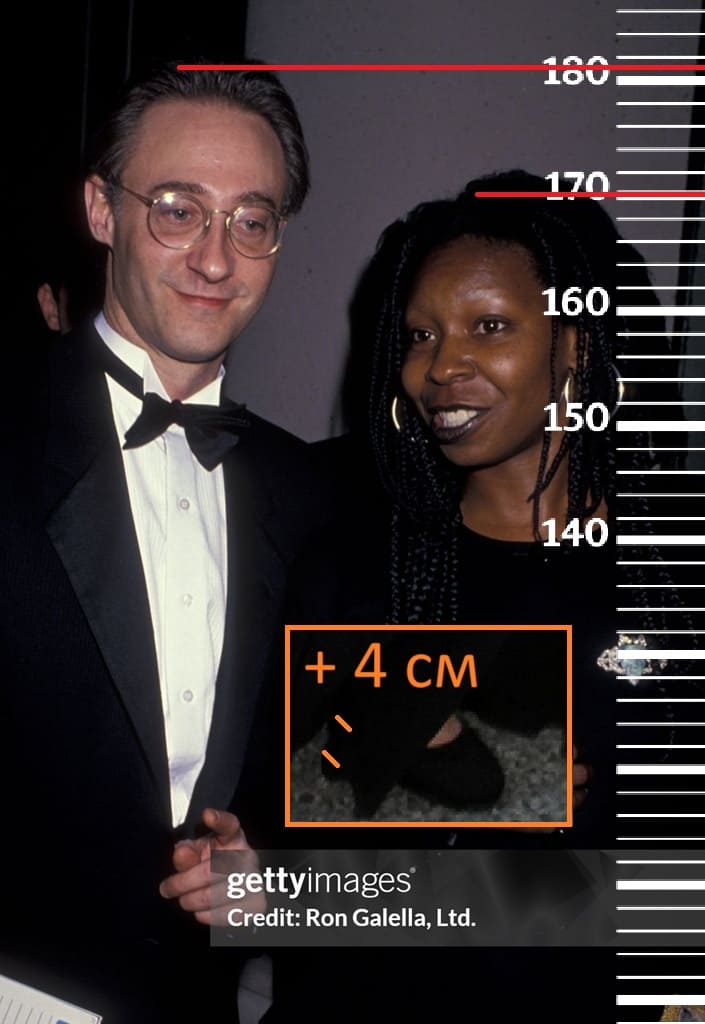 В 1995-м году сравним 40-летнюю Вупи Голдберг с 39-летним Томом Хэнксом, рост которого тогда был на пике формы(185 в обуви, 181 сейчас). Здесь рост Вупи будет 170 сантиметров, но с вычетом обуви мы также получим 166 сантиметров.