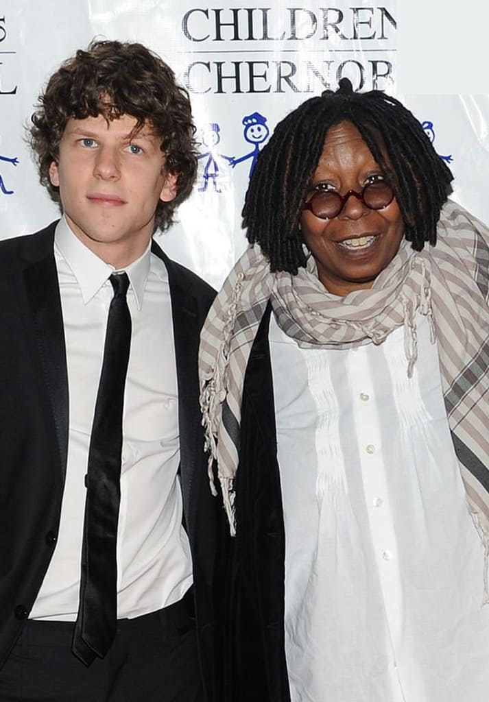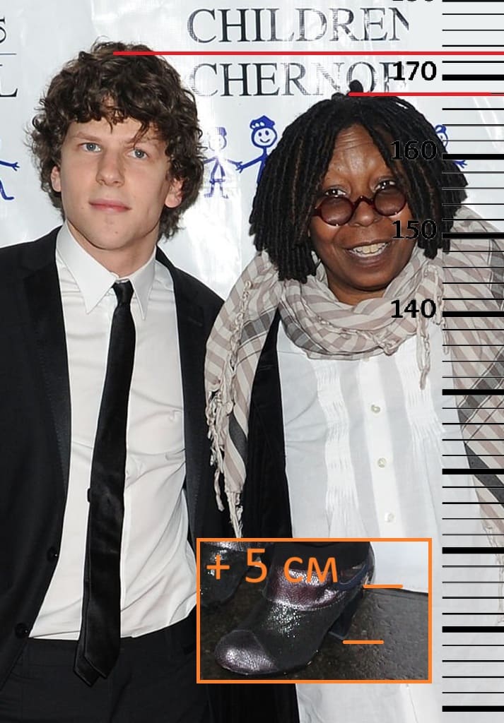 В завершении второй части обзора сравним Вупи Голдберг с Джесси Айзенбергом, максимальный утренний рост которого равен 171 сантиметр(173 в обуви), Здесь ситуация не меняется, и рост Вупи без каблуков также встаёт на отметку 163 сантиметра.
