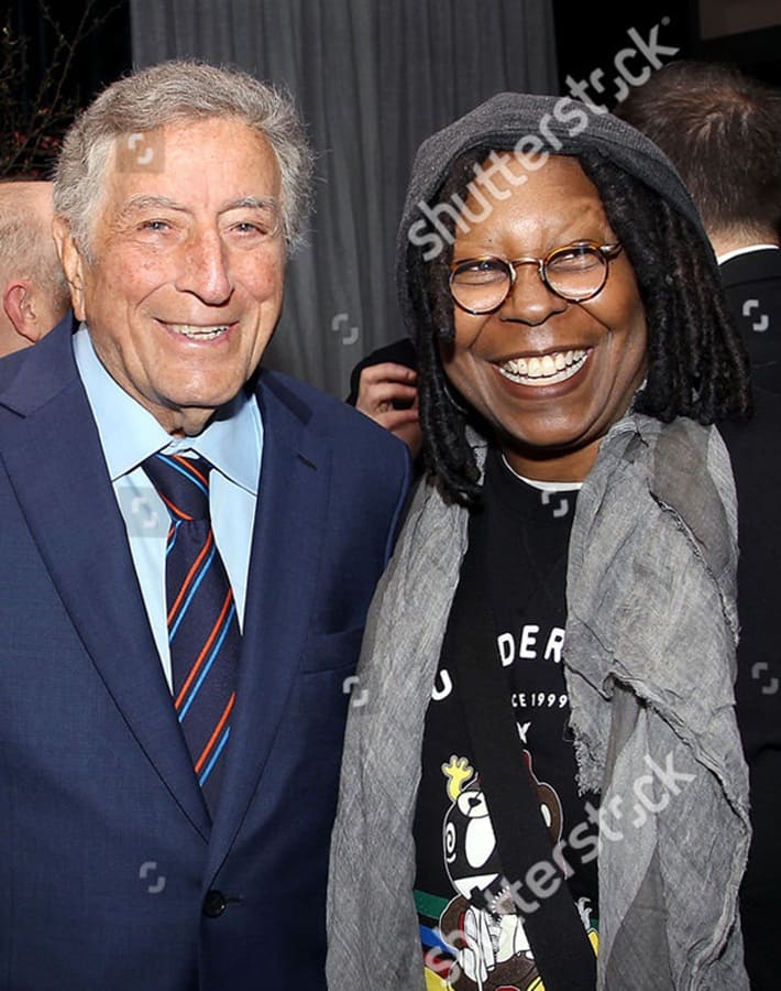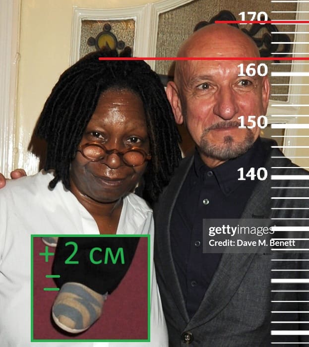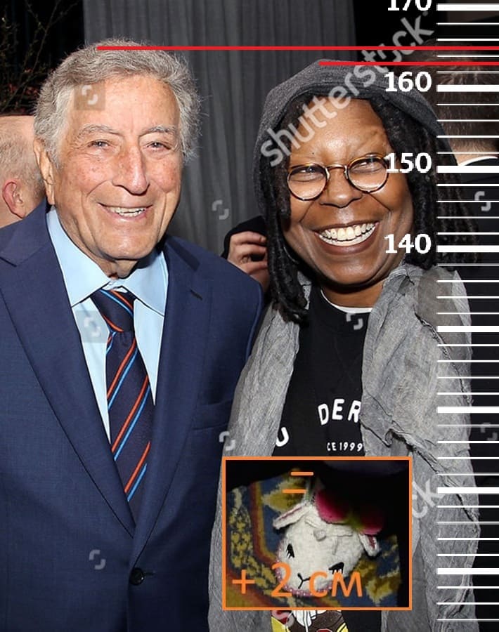 Для начала проверим самую популярную отметку Вупи Голдберг в сети. Для этого сравним Вупи с Тони Беннеттом, рост которого в последние годы жизни на самом деле составлял 165 сантиметров. Как можем видеть, рост Вупи здесь будет только 163 сантиметра, что также сходится с одной из версий в сети.