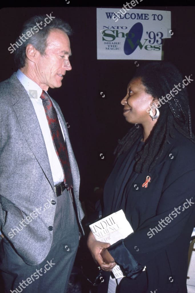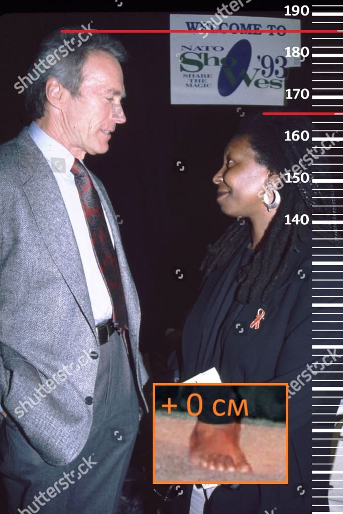 Годом позже, в 1993-м году, сравним 38-летнюю Вупи Голдберг с 63-летним Клинтом Иствудом, рост которого тогда был 184 сантиметра(186 в обуви, 186 на пике формы, 181 в наши дни). Здесь Вупи Голдберг находится без обуви, и рост её будет также 166 сантиметров.