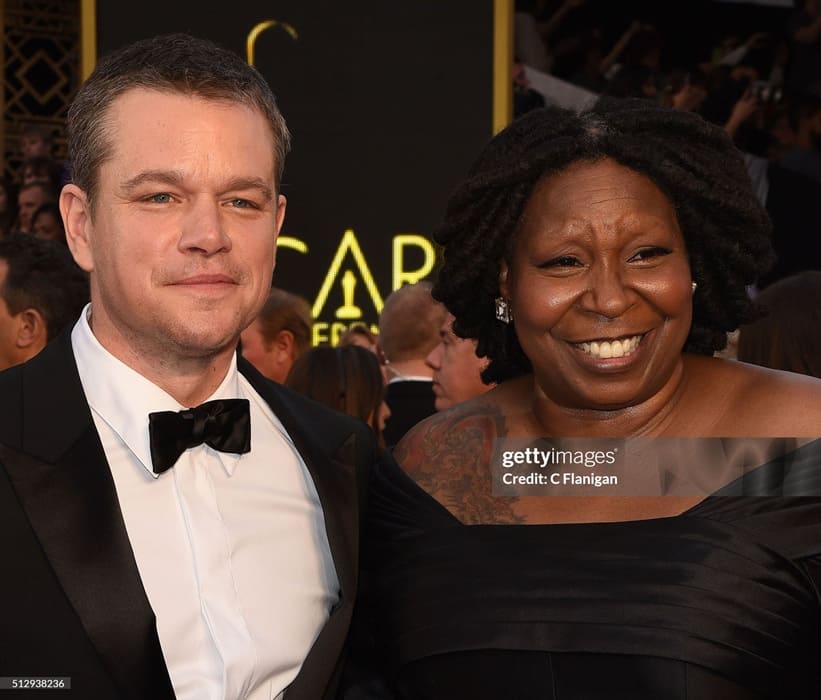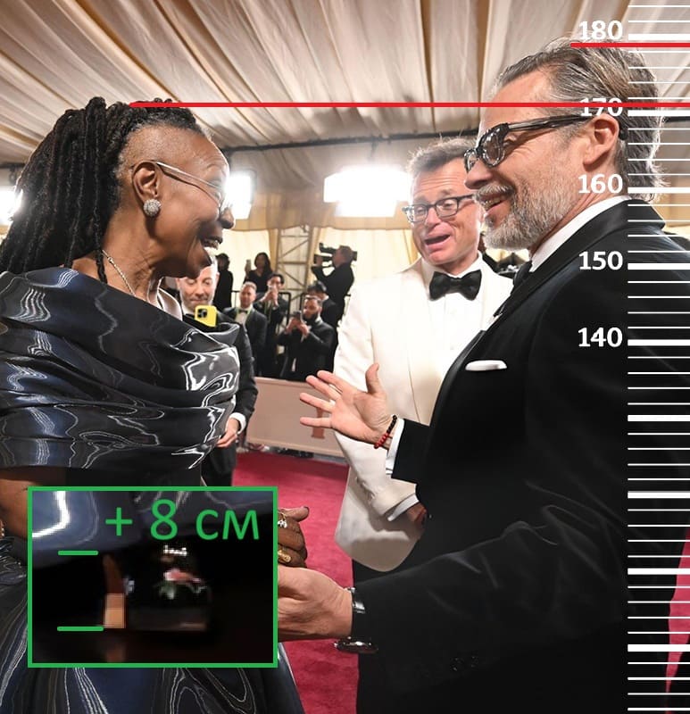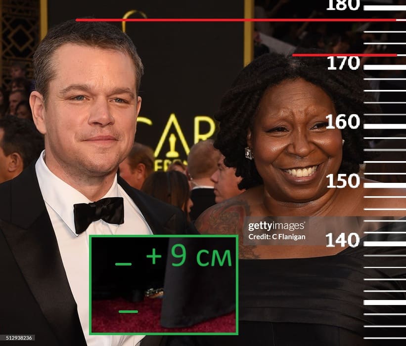 Рассмотрим фото, где сравним Вупи Голдберг с Мэттом Дэймоном, рост которого максимум 176 сантиметров с утра(178 в обуви). Рост Вупи будет 172 сантиметра, но если мы уберём её каблуки, то также получим её рост на отметке 163 сантиметра.