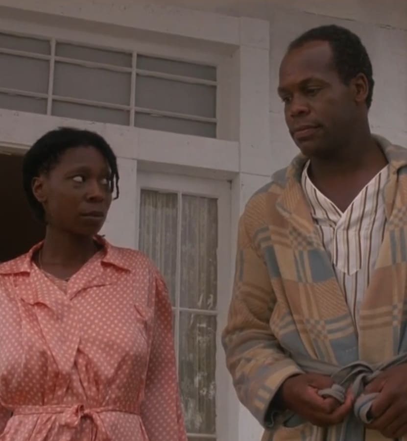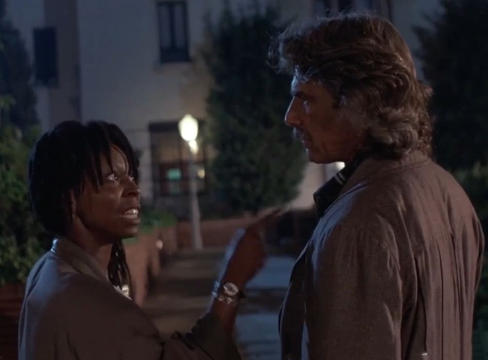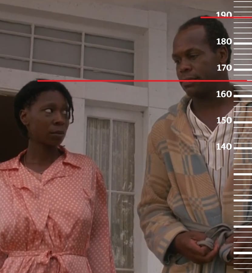 Начнём с 1985-го года. Сравним 30-летнюю, а значит точно находящуюся на пике формы, Вупи Голдберг с 39-летним Дэнни Гловером, также имевшим тогда свой пиковый рост 190 сантиметров(186 сейчас). По фильму, персонажи актёров только встали с кровати и были в тапочках, так что погрешности в обуви здесь не будет. Рост Вупи здесь встал уже на отметку 166 сантиметров. Ну и так как здесь её рост на пике формы, то можно смело сказать, что выше 166 сантиметров по жизни Голдберг не была.