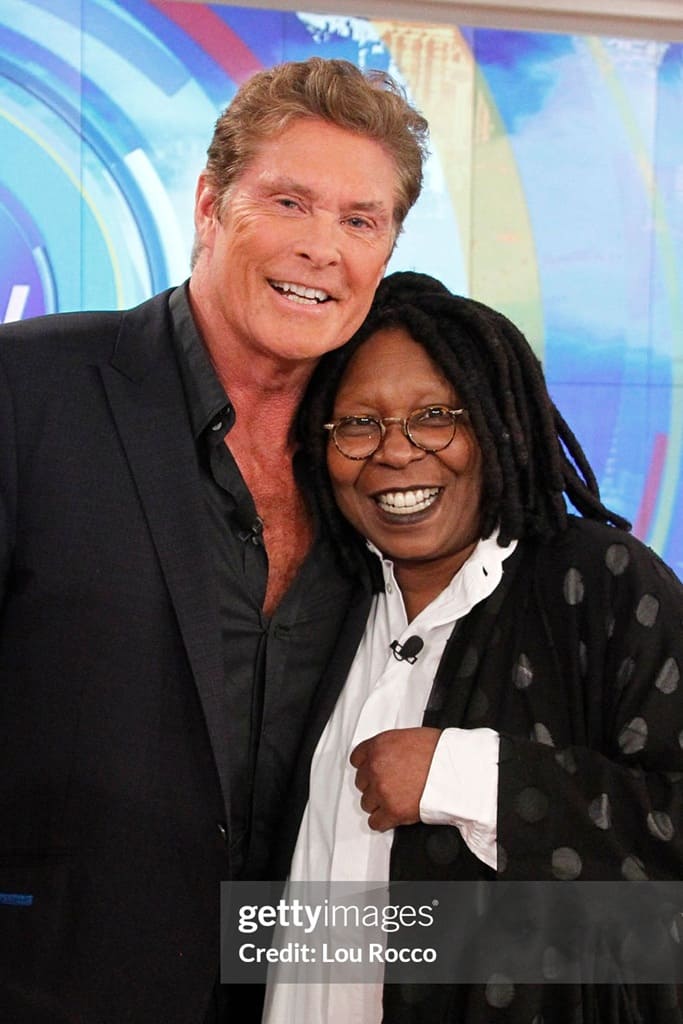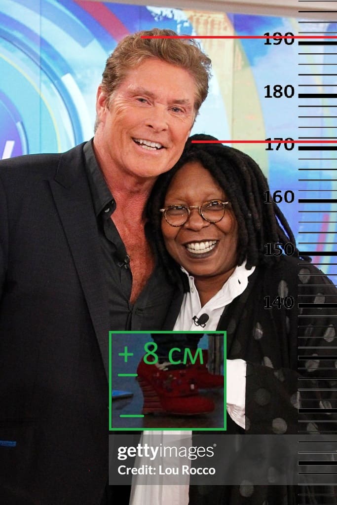 На фото Дэвид Хассельхофф, рост которого максимум 190 сантиметров с утра(192 в обуви, 191 из-за сутулости). Здесь рост Вупи Голдберг будет по-прежнему 163 сантиметра(без каблуков).