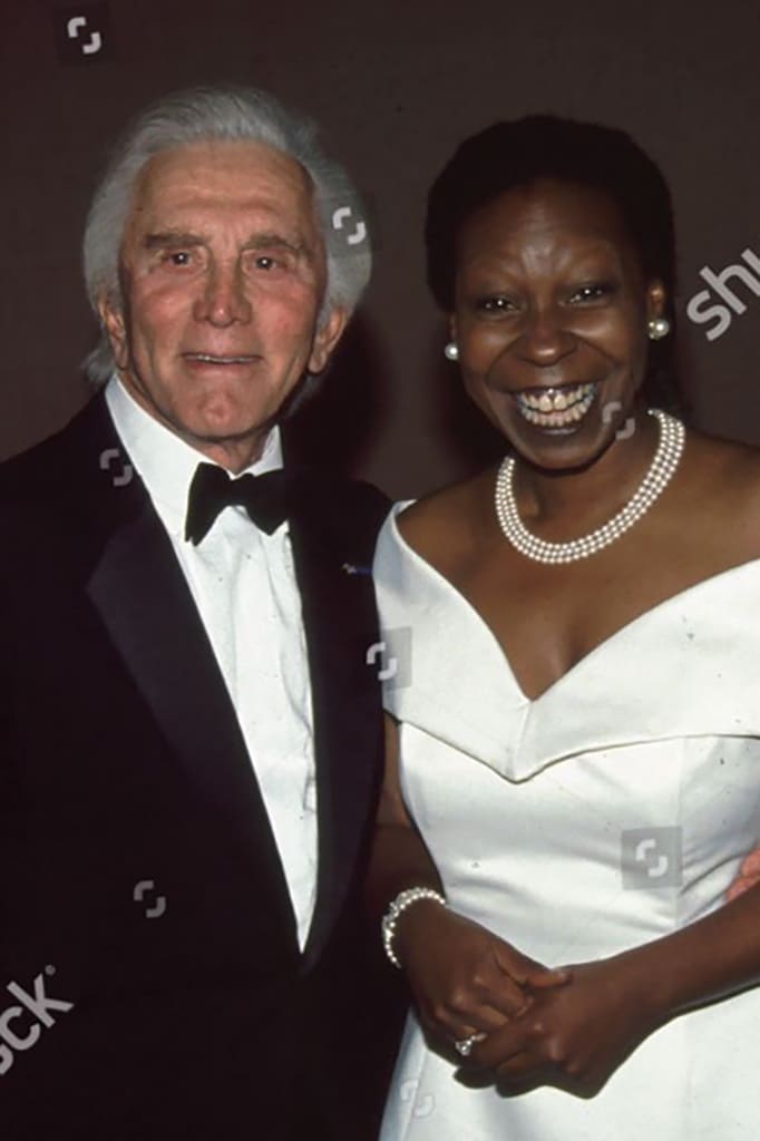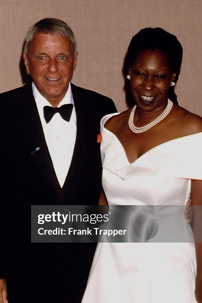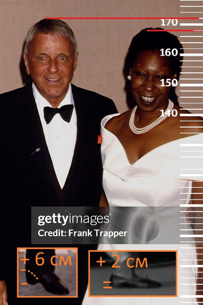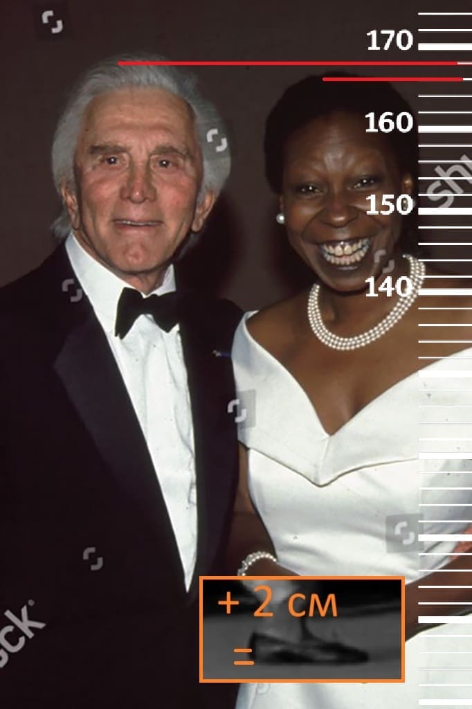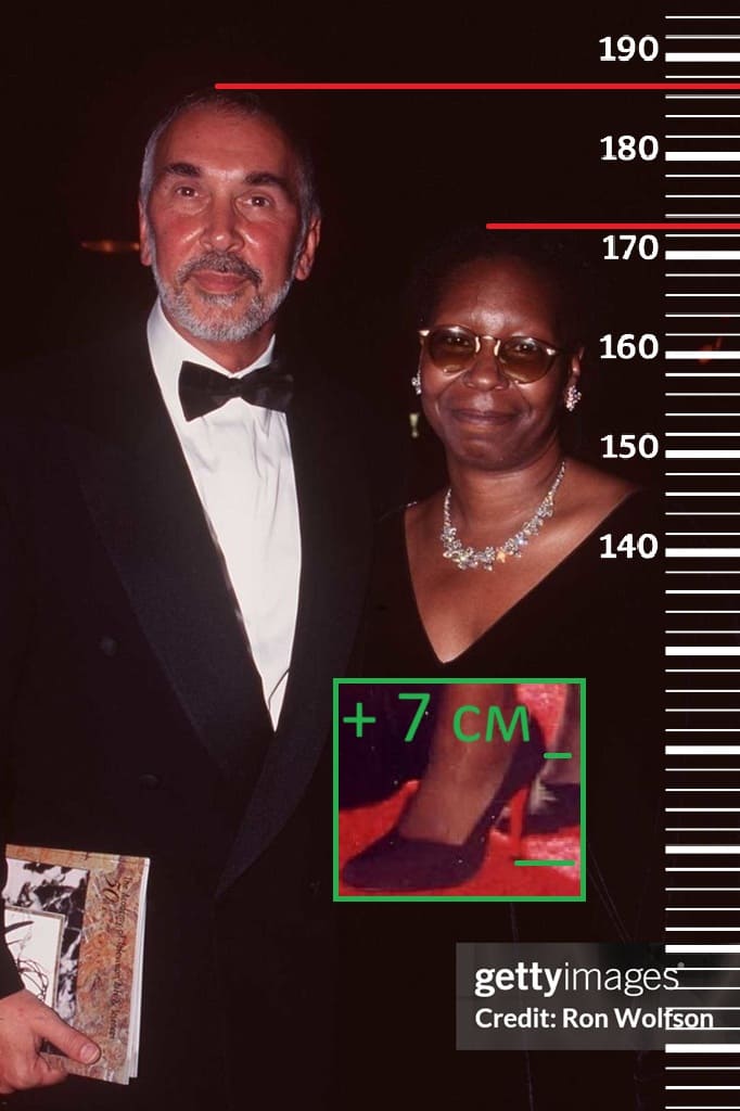 В 1992-м году рассмотрим три фото с одного мероприятия, где Вупи Голдберг имела обувь, равнозначную по подошве со стандартной обувью. Сравним 37-летнюю Вупи с 45-летним Тедом Дэнсоном(1 фото, 189 см тогда, то есть на пике формы, 185 сейчас), 76-летним Кирком Дугласом(2 фото, 168 см тогда, 172 на пике формы, 165 в конце жизни) и 77-летним Фрэнком Синатрой(3 фото, 166 см тогда, то есть в последние годы жизни, 172 в обуви с лифтами, 170 на пике формы). Во всех случаях (в последнем если вычесть обувь) рост Голдберг будет на той же отметке в 166 сантиметров.