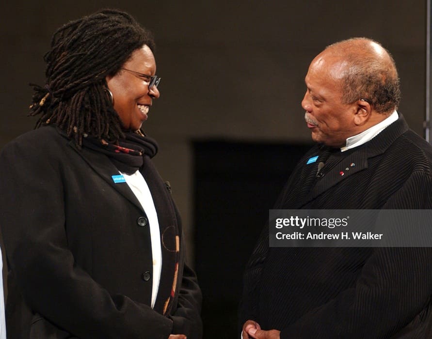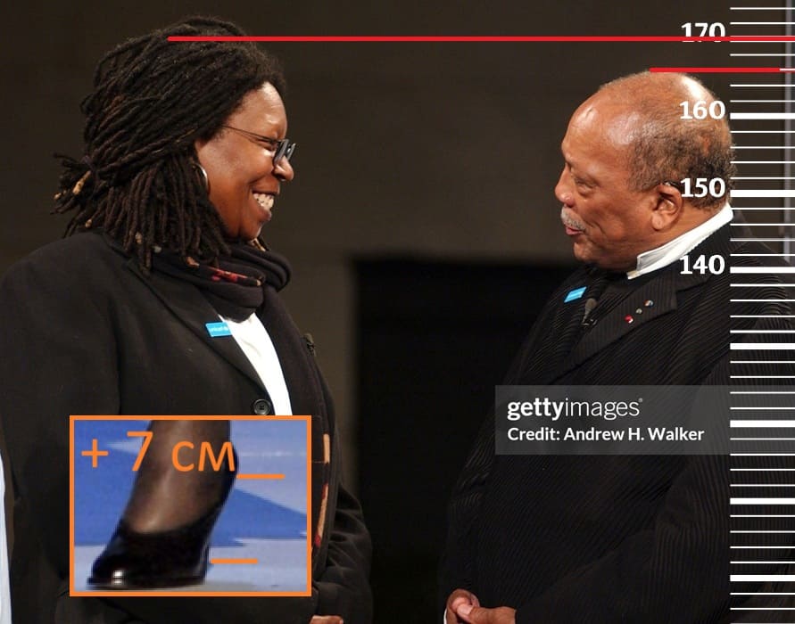 Куинси Джонс в последние годы жизни был чуть повыше, а именно 164 сантиметра(166 в обуви). Здесь рост Вупи Голдберг без каблуков вновь будет 163 сантиметра.