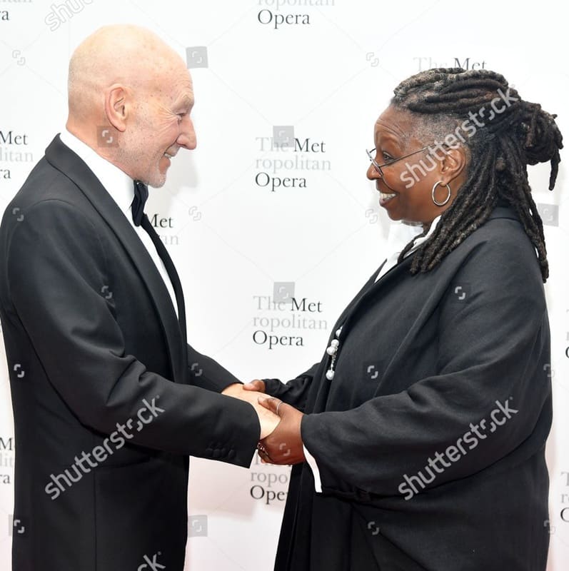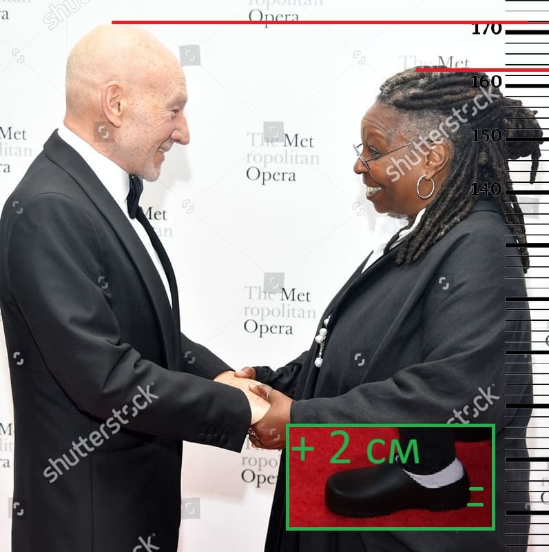 Рост Патрика Стюарта в утреннее время равен 172 сантиметра. Здесь рост Вупи Голдберг будет на тех же 163 сантиметрах.