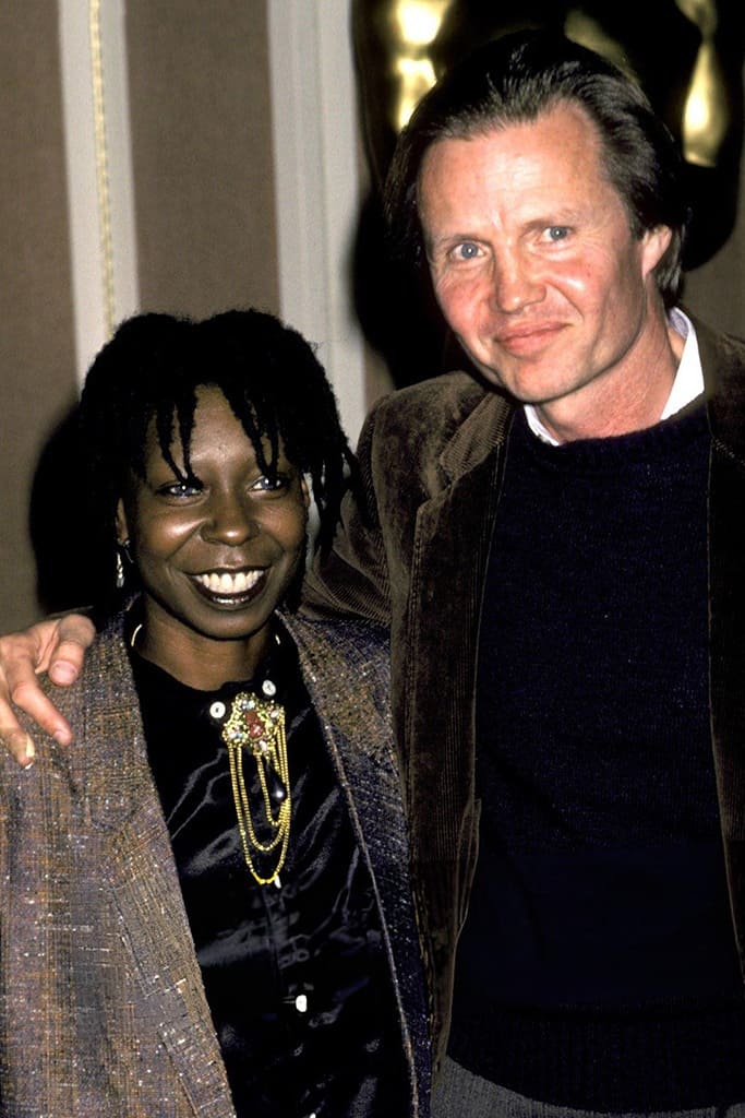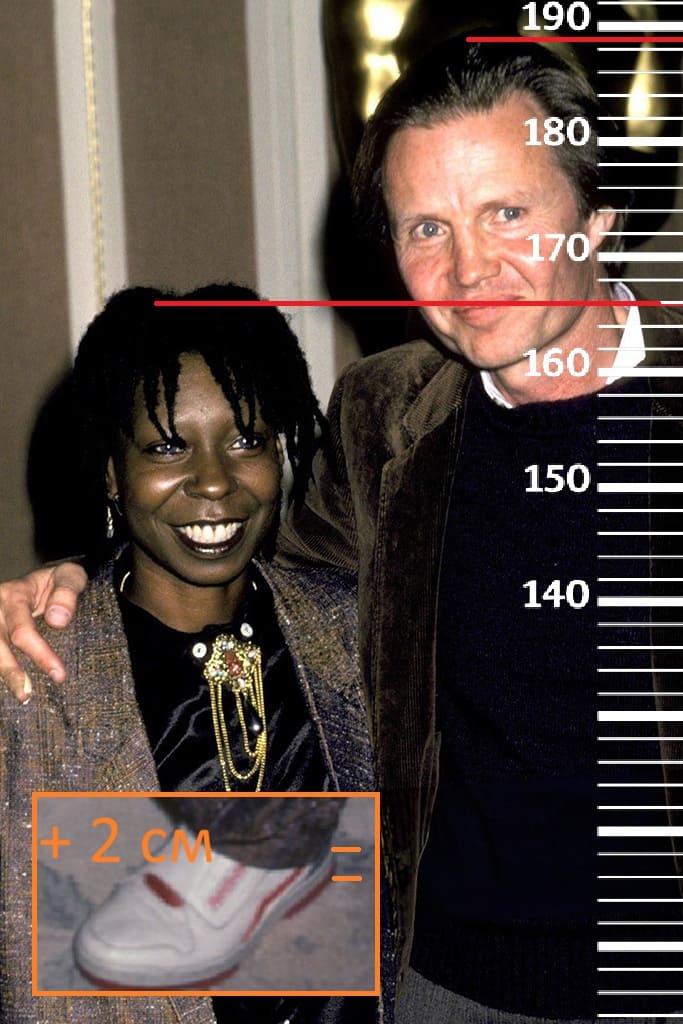 Годом позже, в 1986-м году, сравним 31-летнюю Вупи Голдберг с 32-летним Джоном Траволтой(1 фото, 183 см тогда, то есть на пике формы, 185 в обуви, 180 сейчас) и 48-летним Джоном Войтом(2 фото, 189 см тогда, обувь равнозначная, 190 на пике формы, 185 сейчас). В обоих случаях рост Вупи (с вычетом обуви и без) будет также 166 сантиметров.