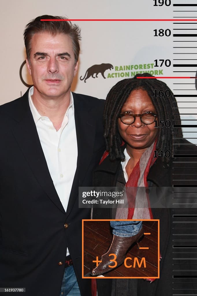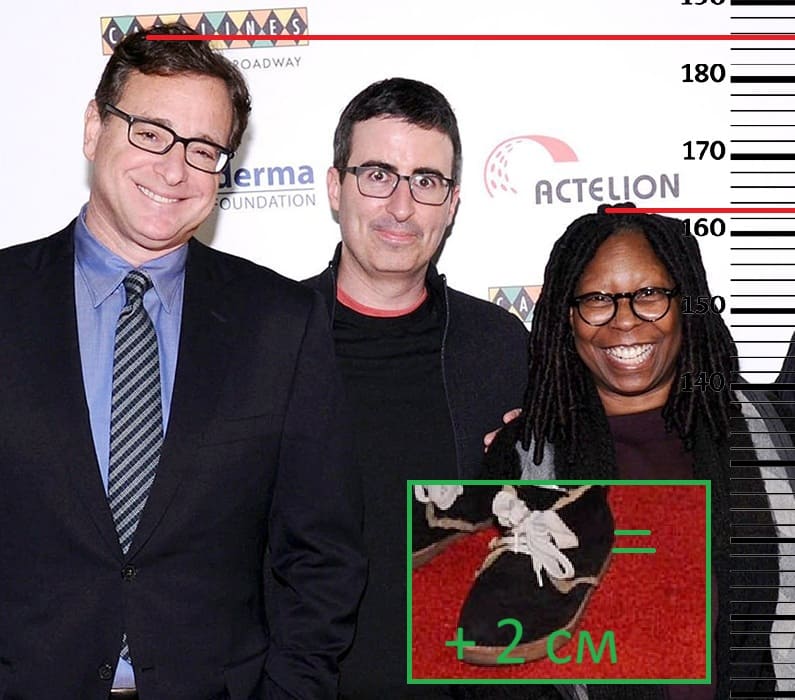 В сети Вупи Голдберг имеет рост от 163 до 168 сантиметров. Самая популярная отметка роста актрисы в сети - 165 сантиметров. Сама же Вупи указывала свой рост либо как 5 футов 5 дюймов (165 см), либо 5 футов 6 дюймов (168 см). Узнаем, какого она ростом на самом деле. Данный обзор будет немного отличаться от обычного - он будет в три этапа. В первом этапе мы рассмотрим фото с мероприятий, где рост Вупи Голдберг не будет под влиянием обуви, так как там на ней обувь равнозначная (актриса довольно часто ходит в обычной обуви). Вторая часть обзора - где она на каблуках. А третья, как обычно, рост Голдберг в других временных промежутках.