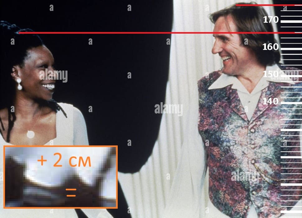 Год спустя, в 1996-м году, сравним 41-летнюю Вупи Голдберг с 48-летним Жераром Депардье, имевшим тогда рост 176 сантиметров(177 на пике формы, 174 сейчас). Здесь рост Вупи будет также 166 сантиметров с учётом равнозначной обуви.