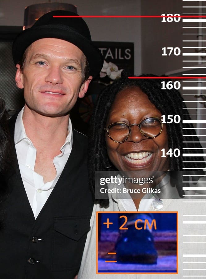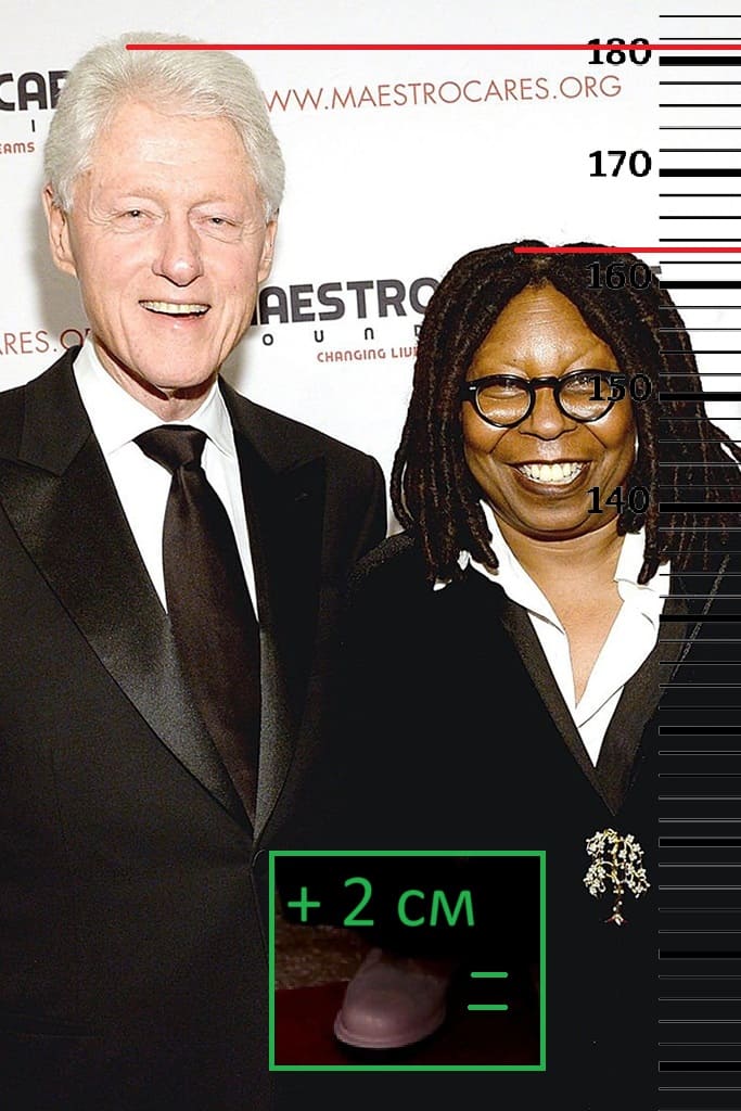 Билл Клинтон(1 фото) и Нил Патрик Харрис(2 фото) имеют одинаковый рост по 181 сантиметр каждый. В обоих случаях рост Вупи Голдберг в сравнении с ними будет 163 сантиметра.