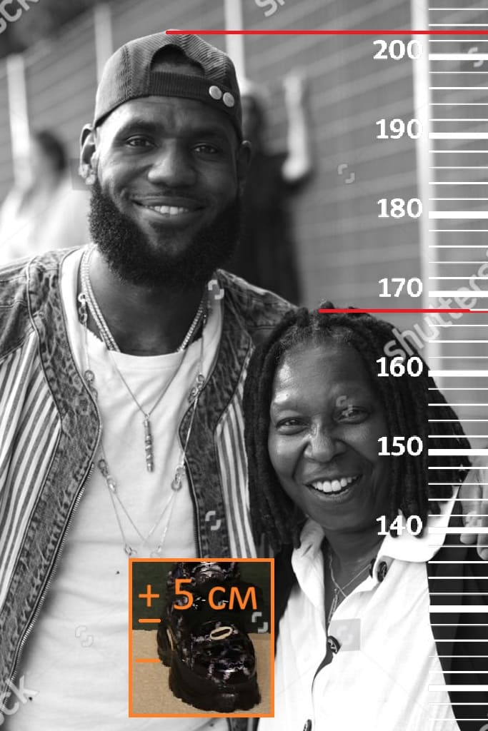 Леброн Джеймс ненамного выше, а именно 201 сантиметр(203 в обуви). Здесь рост Вупи с вычетом обуви будет на отметке также 163 сантиметра.