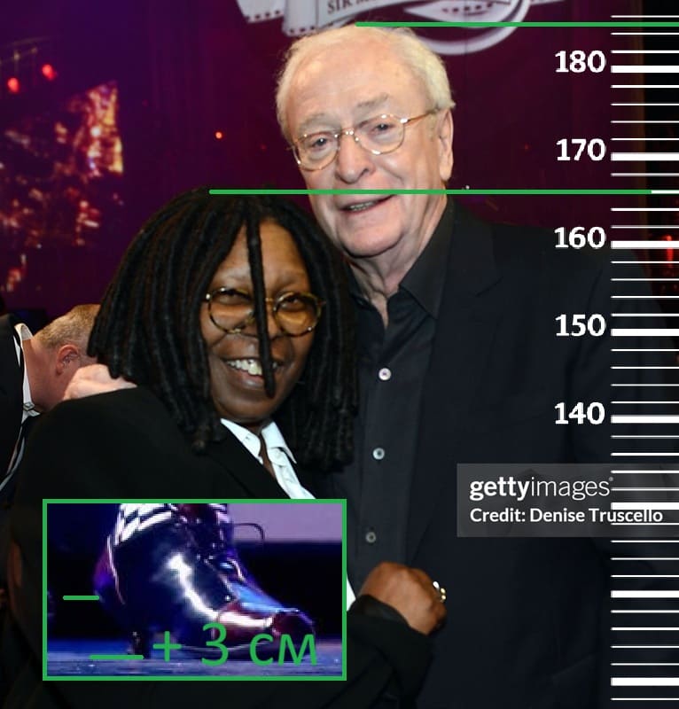 Майкл Кейн(1 фото) и Крис Нот(2 фото) имеют одинаковый рост по 183 сантиметра каждый(185 в обуви). В обоих случаях рост Вупи Голдберг будет 166 сантиметров в обуви и 163 сантиметра без неё.