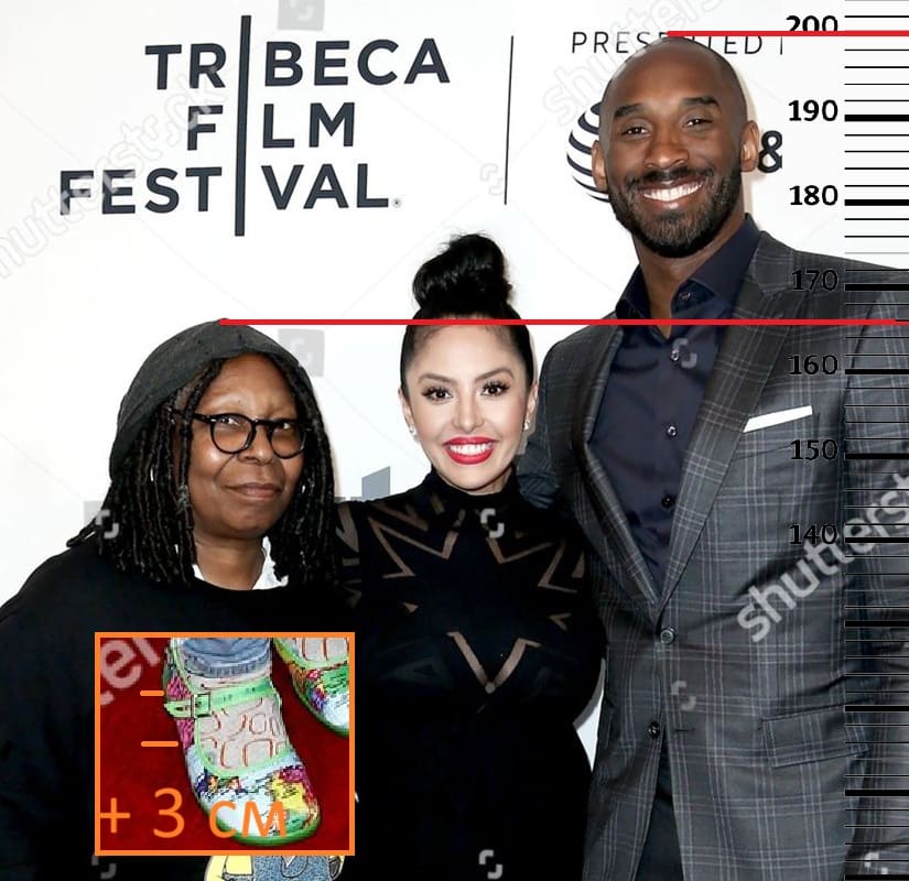 Рост Коби Брайанта при жизни составлял 198 сантиметров(200 в обуви). Здесь рост Вупи в обуви будет 166 сантиметров, а без обуви - те же 163 сантиметра.