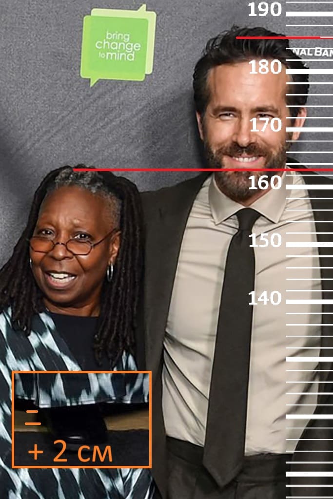 Рост Райана Рейнольдса также не превышает 186 сантиметров. Здесб рост Вупи Голдберг стоит на той же отметке 163 сантиметра.