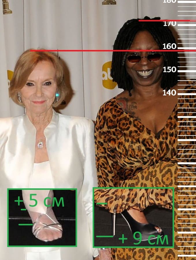 Сравним Вупи Голдберг с Евой Мари Сэйнт, рост которой максимум 154 сантиметра(159 на каблуках). Здесь рост Вупи будет 172 сантиметра на каблуках и также 163 сантиметра без них.